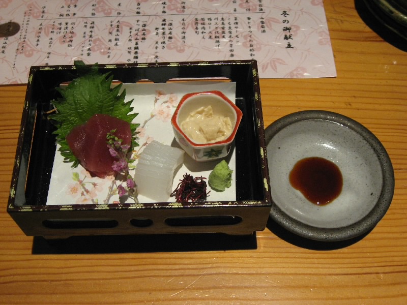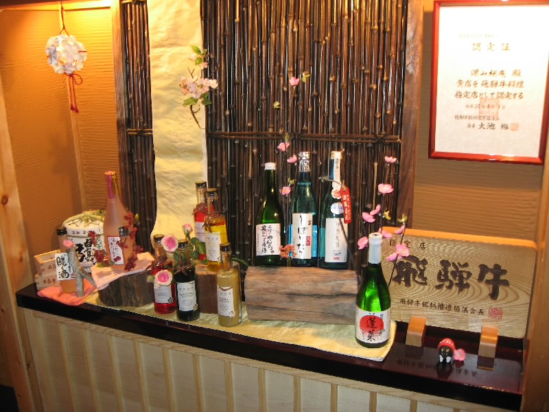 部屋で少し落ち着いたところで、ごはんに行きましょうか。お食事処へ行き、席へと案内される。外に面した、カウンターの2人用席だ。ここは2人だとこういったカウンター席、もっと人数が多いと掘りごたつ式のテーブル席になるようで、どちらも落ち着く席だ。まずは食前酒の山葡萄酒をいただく。ほんのり甘くてフルーティで、なかなかおいしい。これと先付けの「苺とキウイの白酢和え」がよくあう。地酒では「番頭の隠し酒」という変わった名前のお酒がオススメのようで、それをいただく。さて、ではじっくり前菜を楽しみましょうか。7種類の前菜がきれいに並んでいて、こも豆腐や岩魚、川エビなど飛騨らしいものがたくさんあり、どれもおいしい。なによりも見た目がいい。続いては御造り。マグロ、イカそして湯葉。少しずついろいろいただくのは好みです。お酒も進むしね。さて、いよいよ第一のメイン、飛騨牛炙り焼き。炭でジックリ焼いて、ワサビでいただく。結構辛いワサビだが、どうして牛肉とワサビってこんなに合うんだろう。牛肉の脂がワサビの辛味をいい感じに抑え、そして風味がアップするといった具合でおいしい。キノコなどの野菜やアマゴの一夜干しなどもあり、いろいろ楽しめるね。