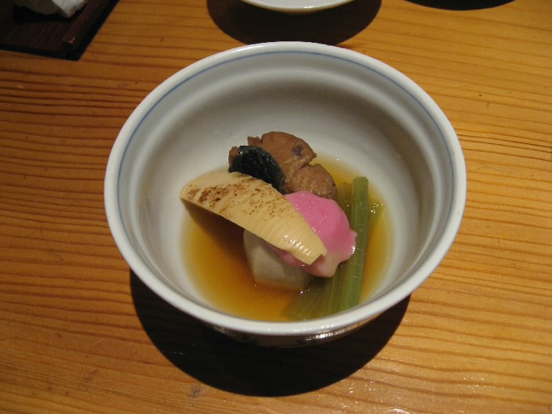 続いては第二のメイン、すっぽん山菜鍋。奥飛騨はすっぽんの産地らしく、この宿の近くにも養殖場があるのだ。ちゃんと食べたことがないので楽しみだな。グツグツといい感じになったところでいただきましょう。すっぽんはとろんとした不思議な食感で、なかなかおいしいぞ。筍や大根などの野菜はしっかりダシを吸っておいしいしね。おつゆまでしっかりいただき、お酒のおかわりもいただく。美味しいものがいろいろあって楽しいねえ。さて、次は煮物。「大岩魚の山椒煮」とやらで、小芋や蕗とともに山椒風味の岩魚をいただく。これは酒のつまみにいい感じだ。さて、そろそろ料理も終わりかな。最後に酢の物の「飛騨牛変わり南蛮」が登場。さっきと同じ飛騨牛でもちょっと変わった感じでまた新鮮だな。さて、あとはシメのごはん。炊き込みごはんにお漬物、そしてちょっと濃い目の味噌汁がいい。最後にメロンなどのデザートをいただき、ごちそうさまでした。