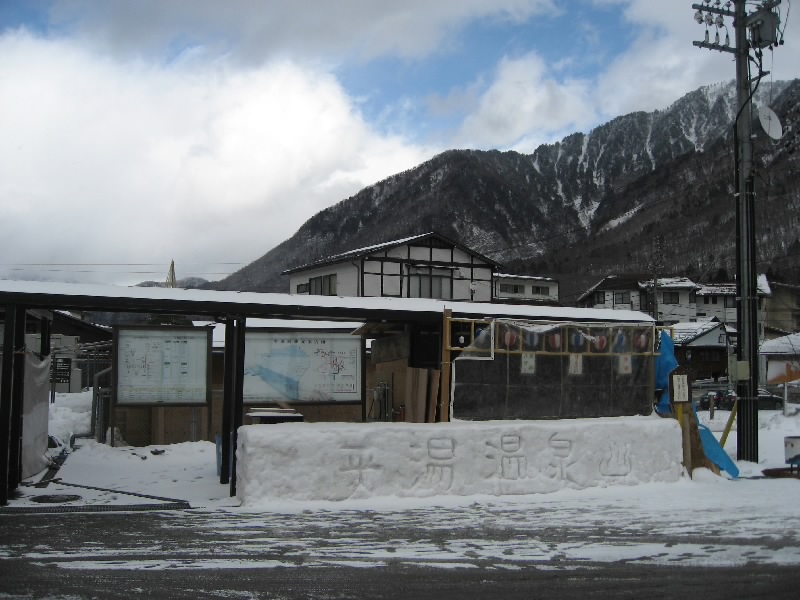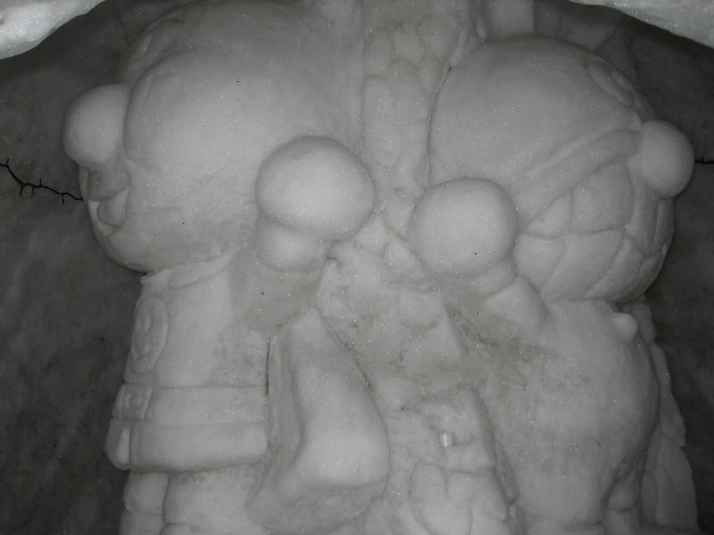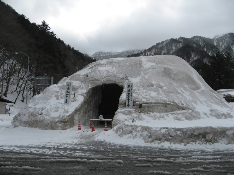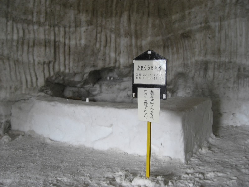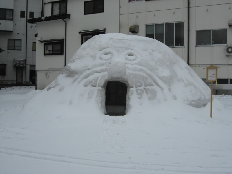 チェックアウトまでは部屋でのんびりすごそう。とはいえ時間は過ぎ、もうすぐ11時。そろそろ行かなければ。気持ちのいい部屋に別れを告げ、チェックアウト。靴を履こうとすると、小さな靴用のホカロンが入っていた。細かい気遣い、嬉しいですね。さて、行きますか。バスターミナルまで向かう途中に、バイキンマン?のかまくらがあった。ちょっと溶けかけているけどね・・・これも昨日からの結氷祭りの一環かな。かまくらの中をのぞいてみると、なんとアンパンマンとバイキンマンがいた。なるほどね。バスターミナル前にあった巨大なかまくら、この中では振舞い酒が行われたらしい。でもこのかまくらも結構溶けかけている・・・ちょっと暖かすぎるよね。