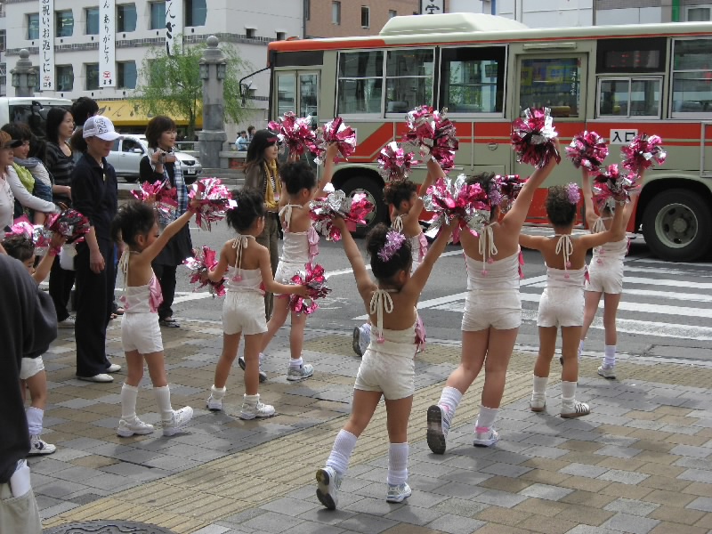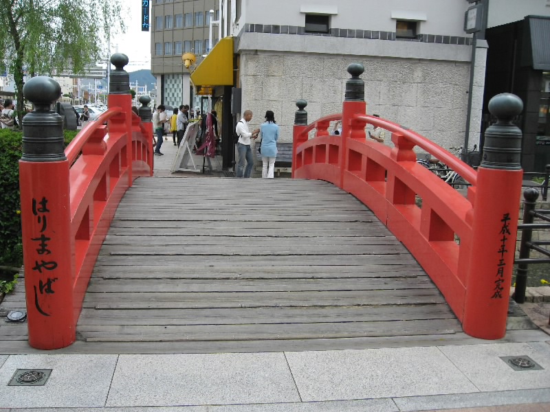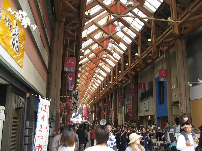 食後の散歩をしよう。少し歩くと、そこは「はりまや橋」。江戸時代に豪商である播磨屋と櫃屋が互いの往来のために造った私設の橋だ。今は大通りの横に復元されている。今となっては小さな橋だが、当時としてはこの赤い色でめだっていたんだろうな。はりまや橋近くにある、全国初らしい木造アーケードに行くと、GWのイベントらしく、よさこい祭りのパレードが行われていた。小さな女の子たちがバッチリ化粧して行進していて、その後ろには女子高生のマーチングバンド。なかなか壮観ですね。アーケードを抜けると繁華街から住宅街へと入ったような感じだな。5/7に宿泊する予定のホテルがこの近くなので下見をし、そのまま高知駅まで歩いて見よう。