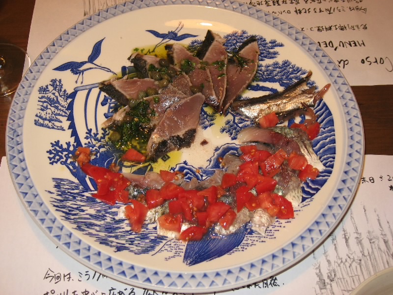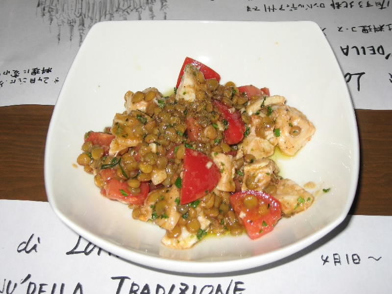 6時になった。そろそろ出かけましょうか。今日の晩ごはんはイタリアン、でもちょっと駅からは遠いし、バスもあまり便利じゃない。ちょうど郊外のイオンモールの近くにあり、そこまでタクシーに乗れば10分もかからない。イオンモールはかなりの規模で、野菜売り場などを見てしばらく時間をつぶす。そろそろ行きますか。「Trattoria da Ryoma bis」というそのお店は、まだオープン間もない時間なので一番乗り。窓際の席につき、さて何にしましょうか。まずは高知らしい前菜「清水サバのシャンパンジュレがけ」と「カツオのカルパッチョ」。白ワインを楽しみながらしばらくすると、大きな皿に盛られて出てきました。高知らしく、皿鉢料理風だね。やっぱり新鮮な魚はうまいねえ。カツオはケッパーと、サバはトマトと、それぞれイタリアンの味付けとなり、白ワインが進む味だ。高知イタリアンはどうかと思ったが、おいしくてよかった。温かくておいしいパンとともにゴキゲンにいただき、あっさり完食。続いては「自家製ツナとレンズ豆とフルーツトマト」。あまり自家製のツナは食べたことがないが、おいしいです。レンズ豆のほっくり感と、トマトの爽やかさとでいい感じ。これもワインが進みます。