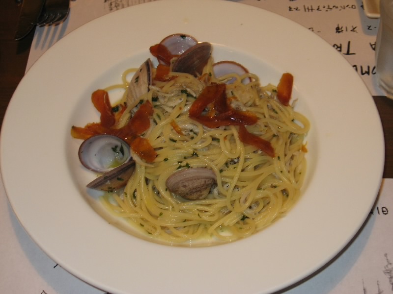 前菜をいろいろゆっくり食べるのがいい。「自家製生ハムとパパイヤ」。これで前菜4皿目だ。熟れたパパイヤの甘みとフレッシュな生ハムの塩気、これもなかなかおいしいですね。他にも食べたい前菜はいろいろあるのだが、そろそろパスタへと行きますか。魅力的なのがいろいろあるので迷ったが「シラスと沖シジミとカラスミのスパ」をいただこう。シラスの塩気がパスタになじみ、海の香りがいい感じ。まるでアサリのような沖シジミもおいしいし、これも白ワインと合いますね。さて、そろそろ満腹、ワインもなくなったことだしデザートへと行きますか。爽やかな柑橘系のゼリーと、ふわふわでコクのあるティラミスをエスプレッソとともにいただき、最後までおいしかったです。