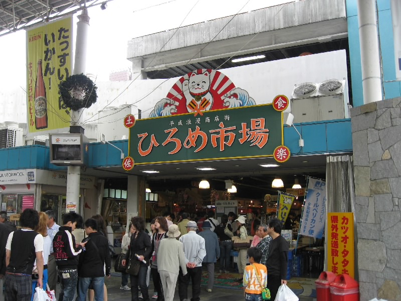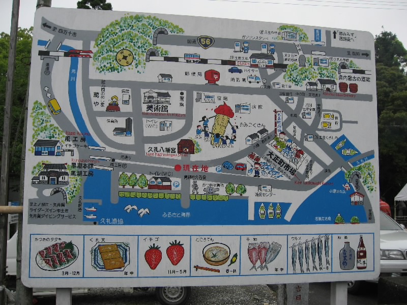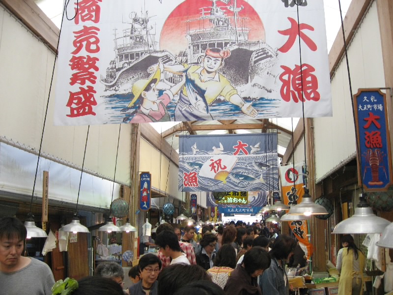 ホテルに戻り、荷物をまとめてチェックアウト。近くのタワー式駐車場から車を出し、出発だ。今日は四万十市まで行くのだが、まずは途中の久礼市場に向けて出発だ。高速で行ってもいいのだが、それほどの距離も無いので一般道で行きましょうか。何度か高速とクロスしながら順調に走る。途中の須崎あたりでなぜか渋滞にぶつかったぞ。高知道が須崎で終わりと思ったら、もう少し先まで須崎道という無料区間が続いていて、そのせいかどうか分からないが、その出口までは渋滞が続いていた。渋滞が終わったと思ったら、今度は反対車線がぎっしり。関西を中心に、県外の車もかなり多いようだ。ようやく土佐久礼エリアに到着、市場へと向かう。カーナビの通りに進むと、やたらと人通りの多い細い道へ。ここが市場なんだなあ、駐車場はどこかなあとゆっくり進んでいくと、市場からさほど遠くないところに駐車場を発見。無事に到着です。