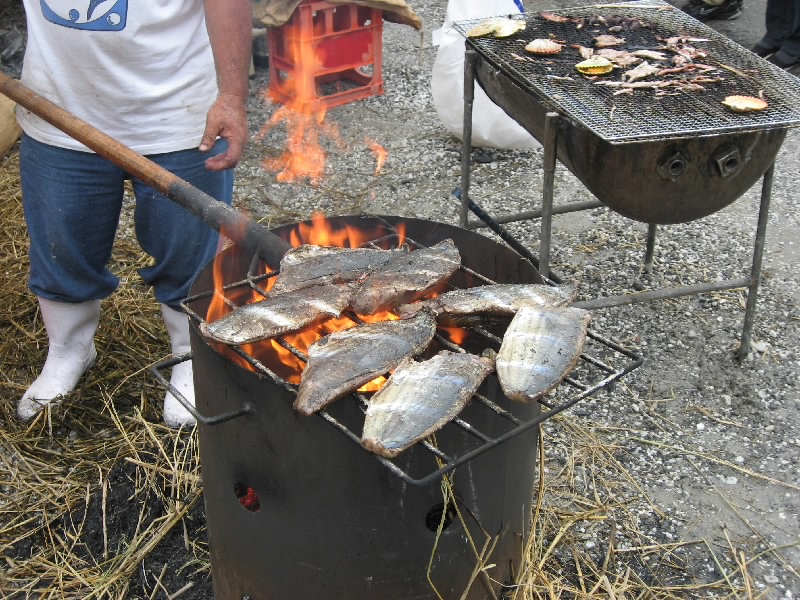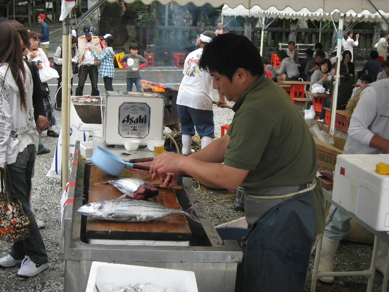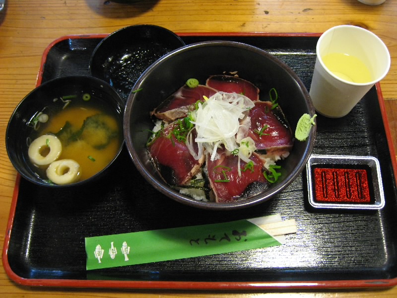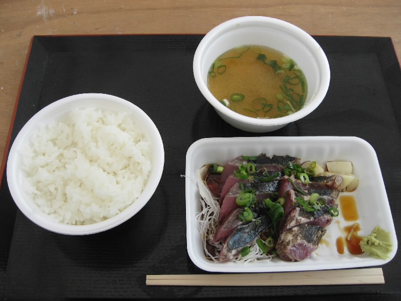 市場に行くと、ものすごい人ごみ。数分で歩ける距離に、たくさんの人が集まっている。やっぱりGWだなあ。この市場は5/9にまた来る予定なので、今日は様子見で。市場の中にある食堂で昼ごはんをと思ったが、ここも大行列。やめときましょ。さあて、じゃあどうしようかなあ。近くにトコロテンで有名なお店があるので、まずはそこに行きましょうか。そのお店まで行ってみると、なんだかその隣の広場にたくさんの人が集まっている。なんだ?近づいてみると、なんど屋外でカツオのタタキが大量に作られていた。これはいい、少し並んでカツオのたたき定食をゲット。すぐそばで焼きあがったカツオでできた定食なので、そりゃおいしいよね。満足満足。