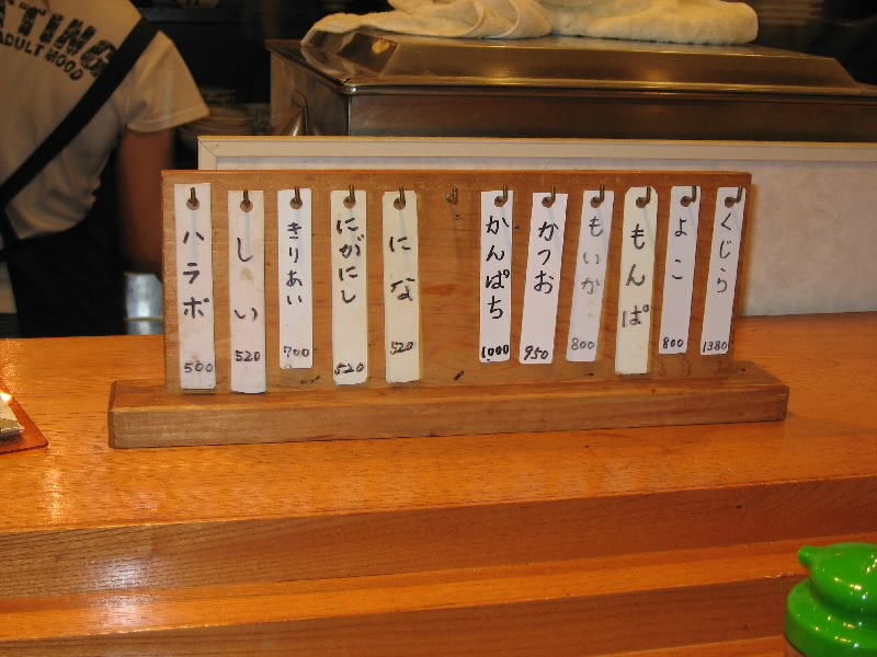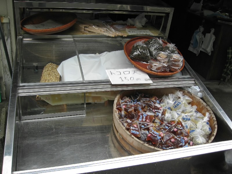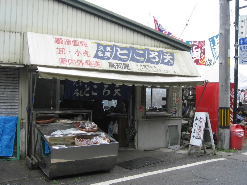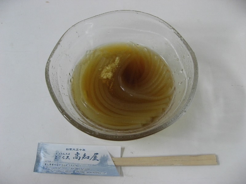 食後にところてんをいただきましょう。「高知屋」という創業80年の老舗のお店で、一人前150円。安いなあ。ガラスの器が涼しげでいい感じだ。つるっとした喉越しの中に、海草の風味がほんのりと感じられる。普段食べるところてんは関西人としては黒みつなので、生姜入りのカツオダシで食べるのは初めてだ。でもこれが本物のところてんなんだろうな。