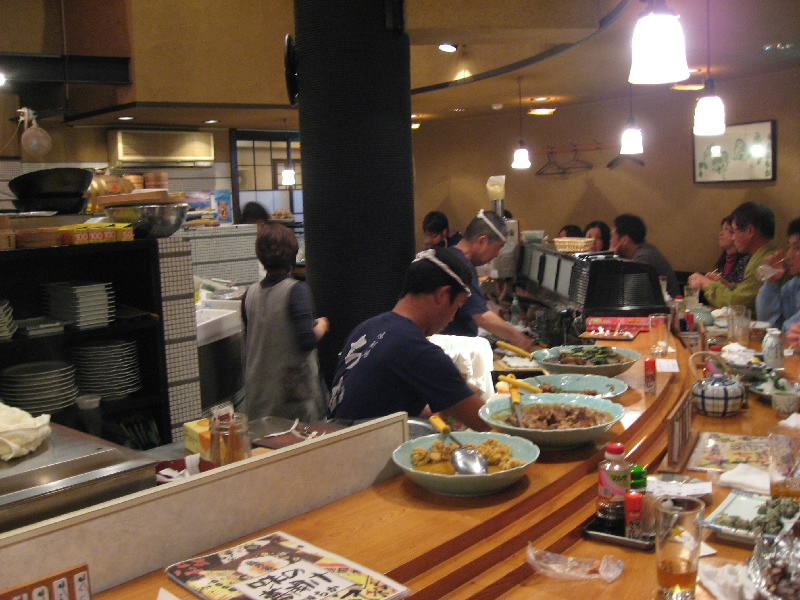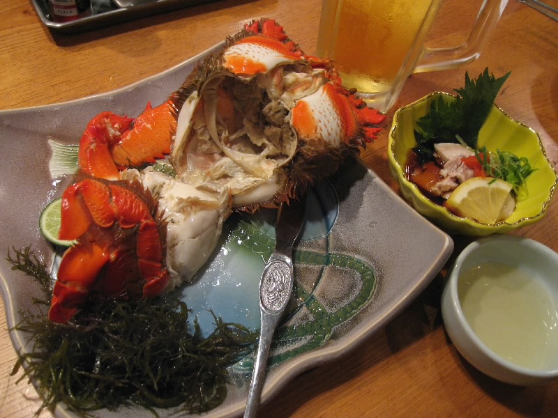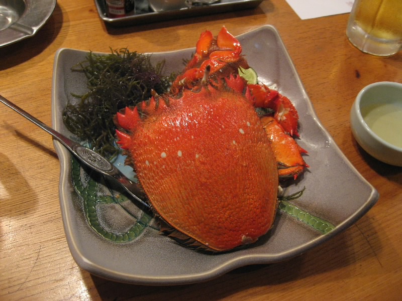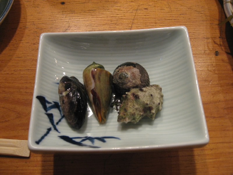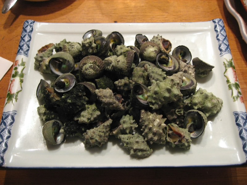 少し休憩して、街へと行きますか。ホテルから街へはちょっと離れているが、ぶらぶら歩くと20分くらい。途中の道にはあまり人通りがないなあ。とはいえ気になるお店の前まで行くと、そこだけは人が集まっていてもうすでに順番待ちの状態。まあ今のところは数組程度だし、他に候補もないので待ちますか。結局、30分くらいで中に入れたぞ。カウンターの一番奥で、落ち着く席につけたのでラッキー。まずは今日のおすすめに書いてあった、旭ガニとサバの白子を注文。ビールで乾いた喉を潤していると、なんと旭カニがちょうど終わってしまったとのこと。でもお店の人が最後に注文した人と交渉してくれたらしく、半分をいただけることになった。申し訳ないですねえ。しかも殻は一匹分がついてきたので、ミソはたっぷり。おいしいなあ。でもこれは高知産ではなく、オーストラリア産らしいんだけどね。サバの白子は初めて食べたが、やっぱり白子、コクがあっておいしい。野菜もほしいので、トマトとバラフ。バラフってなに、と思って聞いてみると、南アフリカ原産の野菜らしく、肉厚な葉っぱに少し塩気を感じる不思議な野菜。さて、次は何にしようか。お店の熊田陽子似のお姉さんに、高知らしいものは何かと聞いてみる。何でも珍しいところではいろんな貝がおすすめとのことだが、名前がよくわからないのでサンプルを持ってきてくれた。とはいえ見てもよく分からないのだが、「にな」と「にがにし」を頼んでみよう。しばらくして出てきたものは、予想外のたっぷりサイズ。爪楊枝でくるっと取り出しながらいただくのだが、になは超小型のサザエかな。尻尾までうまくとるのがなかなか難しいがクセになる。にがにしは名前の通り結構苦味がある大人の味。日本酒があいそうだが、なんだか今日はビール気分、どんどん飲みましょう。