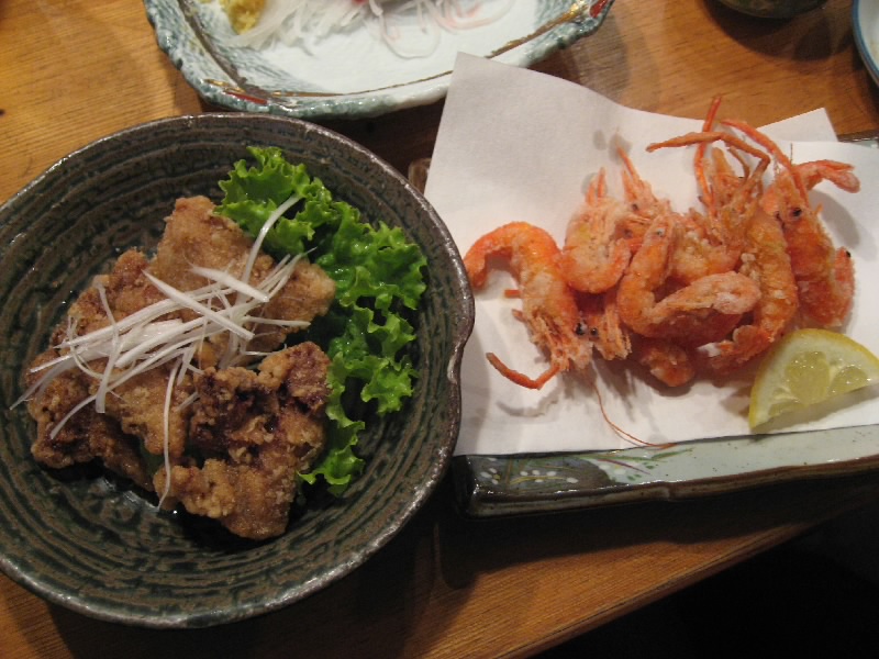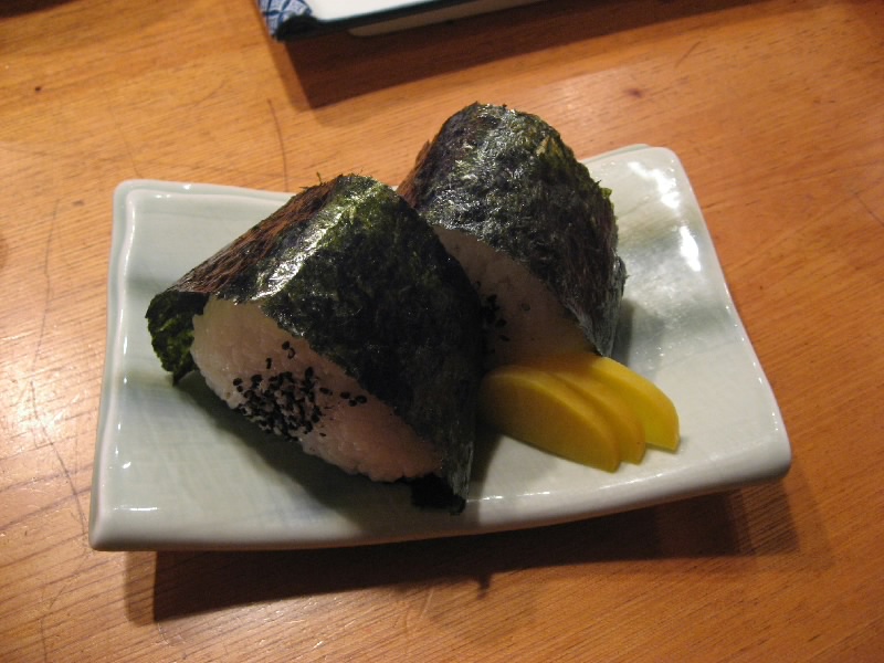 さてさて、まだまだいただきますよ。高知らしいところで、鯨の刺身かな。半分凍ったルイベ状態だが、口の中で溶ける感じがなかなかの美味。続いても鯨、今度は竜田揚げで。これは肉の甘みがよく出ているなあ。ビールがよく進むぜ。さらに進むのは、川エビのから揚げに青さのリの天ぷら。どちらも四万十川の幸で、川エビってこんなにしっかり大きいんだね。香ばしくてうまいぞ。青さのりはしっかり厚めでサクサク系。のりの香りがいいですね。海の幸と川の幸、どちらも堪能しました。シメにはおにぎりをいただき、満腹です。ごちそうさまでした。