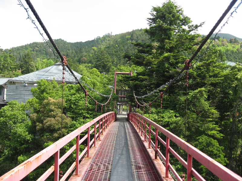 ホテルをチェックアウト。車に荷物を入れ、しばらくはホテルの周りを散策しましょう。すぐ目の前に広場があり、そこにアスレチックな遊具を発見。縄ばしごをわたったり丸太を歩いたり、久しぶりに童心に帰る。でもやっぱり昔の動きのイメージとはほど遠く、体がついてこないなあ。これが現実、アラフォー過ぎてるしね・・・山へと続くつり橋があるぞ。鉄製のしっかりした橋ではあるが、足元から網越しに底が見えるので怖い人はアウト。静かでいい天気の中、散歩しながらのんびりした時間をすごす。さあて、そろそろ行きますか。