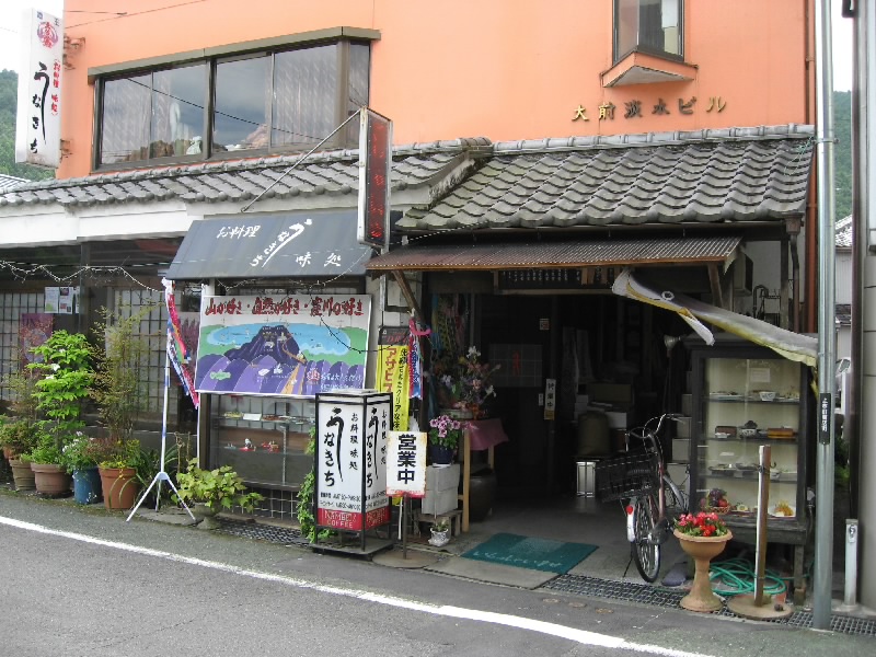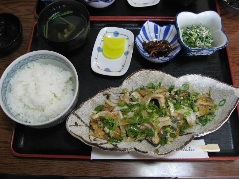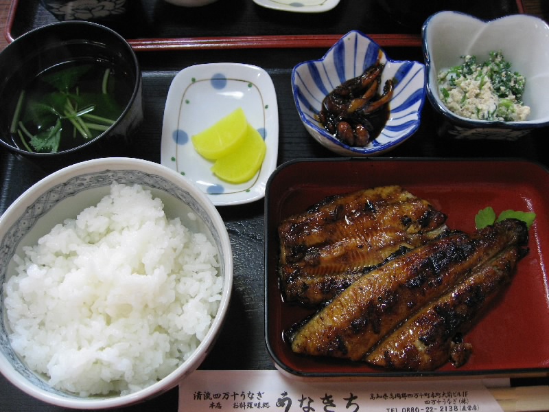 とりあえずは窪川に向けて走る。途中、四万十川の流れがよく見えるところで停まって写真を撮りながら、ゆっくり走る。11時ごろ、窪川到着。ここに来た目的は、「うなきち」といううなぎ料理屋さんだ。狭いが駐車場もあるので車を止め、まだちょっとお昼には早いが入りますか。中に入ると、それほど広くない店内にはうなぎを焼くいい匂いがしている。さあて、何にしようかな、やっぱりしっかり四万十のうなぎを食べたいので、うなぎのタタキ定食と蒲焼定食を注文。しばらくするとなんだかいい匂いがしてきたぞ。そしてそれぞれの定食が登場、早速いただきましょう。うなぎのタタキはさっぱりとして、でもうなぎの香ばしさとふんわり感がしっかりと味わえ、たまねぎとの相性もとてもいい。これ、うまいなあ。蒲焼はやわらかくて、すばらしく香ばしい。まだそれほどおなかがすいていないはずなのに、ばくばくと食べてしまいます。小鉢ででてきたうなぎの肝もまたよし。車じゃなければお酒がほしいところだが・・・それはやむおえまい。足摺岬で食べたうなぎはちょっと硬くて味付けも濃かったが、ここのはうまい。いやあ、来てよかった。ごちそうさまでした。