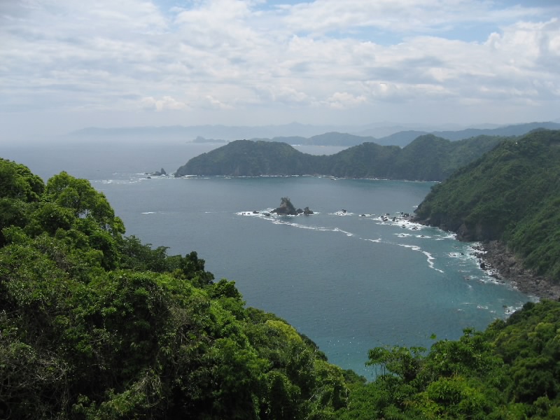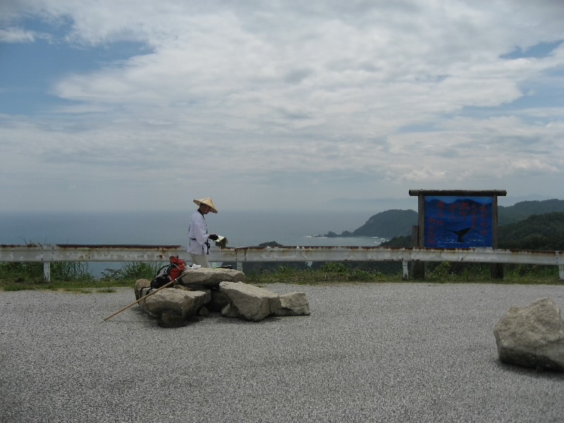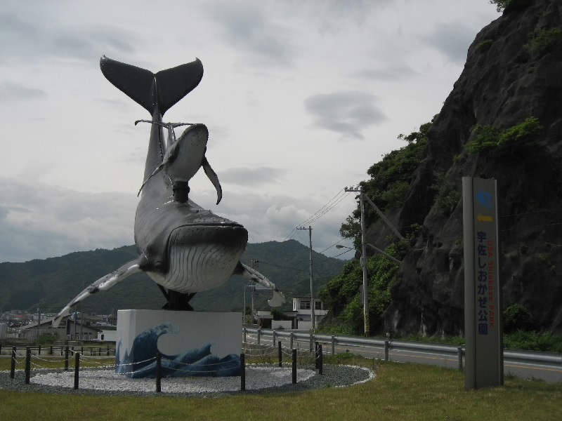 そろそろ須崎。来るときはこのあたりがかなり渋滞していたが、今日はスムーズに走れる。やっぱり5連休が終わって、車の数がぐっと減った気がする。ここから高速に乗ってもいいのだが、それではおもしろくないので海沿いを行きましょう。横浪スカイラインという道を目指して走る。ん、どんどん山道になっていくぞ。途中野良キジが目の前を横切ったり、たくさんのトンビが飛び交っていたり、どう見ても山ではないか。地図上では海岸沿いの道だが、実際通ってみるとすごい山道で、それでも確かに海は見える。高いところから見下ろす断崖絶壁が絶景だね。こんなところでも、お遍路さんがいる。この先にある青龍寺に向かっているのだろうが、このルートは大変だね。しばらくして、ようやく海岸に近いところまで下りてきたぞ。水平線がきれいに見える。スカイラインを抜け、市街地に入ってきた。このあたりは宇佐という場所で、公園には巨大なクジラのオブジェがあった。ここからホエールウォッチングの船も出ているようだが、どのくらい見えるのかな。