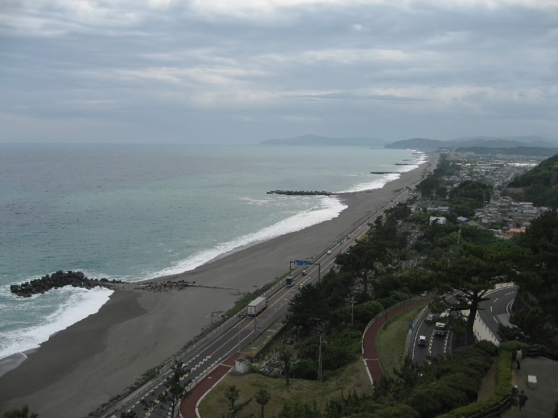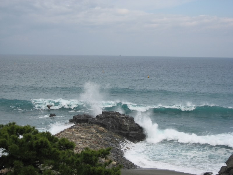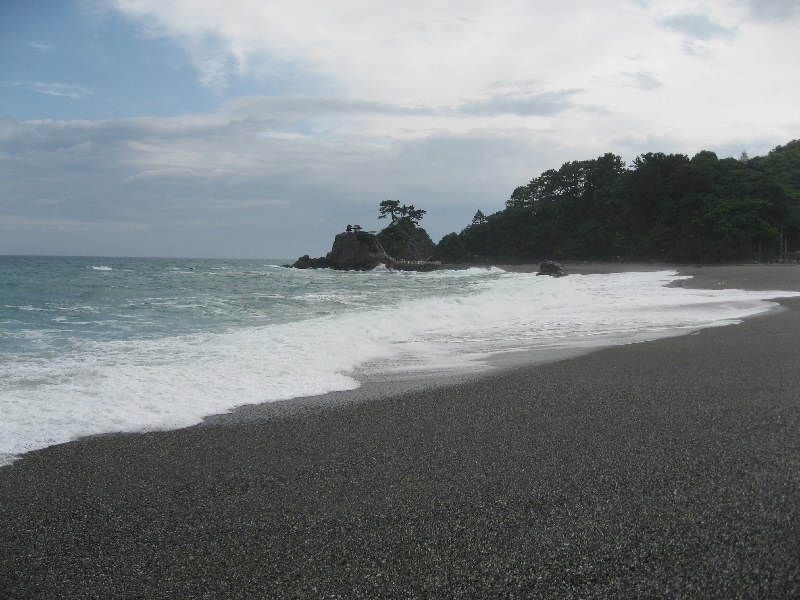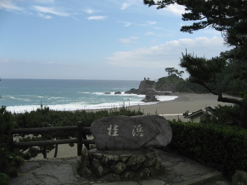 浜辺へと行こう。松林を抜けると、そこに竜馬の像があった。思っていたよりかなり大きい。太平洋をじっと見据えて立っている龍馬、かつてこの場所で遠くに世界を見ていたのだろうか。浜辺に下りてみる。波がかなり荒く、繰り返し岩へと打ち付けている。荒々しい力強さ、これが太平洋なんだね。粗い砂浜を歩き、岬の岩の上の鳥居まで行ってみよう。急な階段を上がると、そこには石造りの鳥居があった。さらに上に行くと大きな松の木があり、遠くに水平線を眺めることができる。視線をすぐ下に向けると、岩に打ち付ける激しい波、この海岸は遊泳禁止だそうで。このあと闘犬センターへ行ったが、今日は何も見ることができなかった。近くのお土産やさんでお菓子などをゲットし、そろそろ行きますか。途中でガソリンを入れ、高知市内へと車を走らせる。