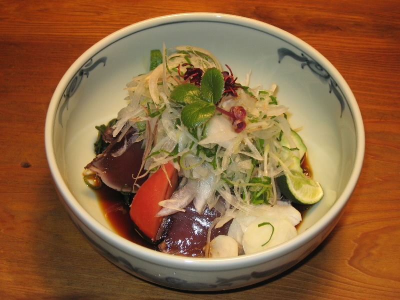 今日のホテル、セブンデイズプラスに無事到着。シングル2部屋のコネクティングルームだが、要するにスイートルームのように使えるのでなかなか便利。新しい、気持ちのいいホテルだな。少し休憩して、晩ごはんへと行きましょう。初日にも行った居酒屋エリアに行き、「こうじ屋」へ入る。ここはメニューに土佐ジローがいろいろあるので、魅力的だったのだ。それにしても人が少ない。まだ時間が早いとはいえ、一番乗りとはね。やっぱり5連休初日は人が多かったんだな。いつも通り、まずはビールで乾杯。ドライブで疲れた喉に染み渡るぜ。お通しは手作り豆腐にエビ・ウニ・イクラを乗せたもの。さっぱりしてうまいぞ。スタートにはいい感じです。一昨日・昨日と温泉宿だったので、自分でいろいろ頼むのは久しぶりに感じる。まずはやっぱり、カツオのたたき。それも「漁師風ぶっかけ」とやらをいただきましょう。薬味たっぷりという説明に惹かれて頼んでみたら、確かに薬味たっぷりだ。カツオも新鮮でおいしいな。この旅何度目のカツオだろうか、もっと食べたくなるね。続いては「高知でとれた冷やしトマト」。冷たく甘いトマトがしゃきっとしていいね。
