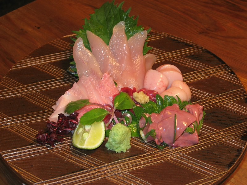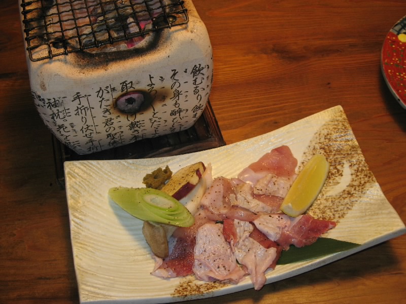 次に頼んだのは「土佐ジロー刺身盛り合わせ」。食べたことがないようなものが並んでいるので、お店の人に教えてもらおう。ササミ・レバー・心臓は分かるが、この平べったいスライスはなに?これはなんと鶏冠(とさか)。あの鶏冠が薄くスライスされているので、最初と最後はいかにも鶏冠なぶつぶつがよく分かる。鳥嫌いにはたまらないな・・・食べてみると、こりこりとした食感でなかなかの美味。あわびっぽい感じがするね。もう一つ、白っぽいぷよっとしたものはなに?そうかも、とは思ったが、いわゆる白子。とろんとした舌触りがいかにも白子で、後からすっとコクを感じる。新鮮じゃないとここまでいろんな部分は食べられないよね。本日のメニューにあった「焼き空豆」はちょっと・・・おいしいが、もう少しふっくらした肉厚なものが出てきてくれないとね。市場にはあったように思うのだが。ここで、日本酒へとうつりますか。当然土佐の地酒ということで、吟醸生酒の瀧嵐。米の風味がさわやかで、すっきりしたおいしいお酒だね。「ジローの炙り味比べ」はモモ肉と胸肉を食べ比べられる。炭火でジックリと焼き、しっかりした歯応えを楽しみながら日本酒とともにいただく。おいしいね。もう少し野菜を食べたいということで、「フルーツトマトとチーズのサラダ」。ちょっとイタリアンテイストだが、もう少しチーズがしっかり入っているとよかったかな。味はおいしいけどね。さあ、いろいろ食べたな。お店もようやく人が入り始めたようだ。そろそろシメ、「土佐ジロー親子丼」。これが食べたかったんだよね。濃厚な卵とジューシーな肉、それがごはんと絡んで予想通りおいしいな。さらっと完食し、ごちそうさまでした。