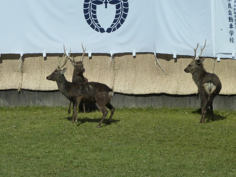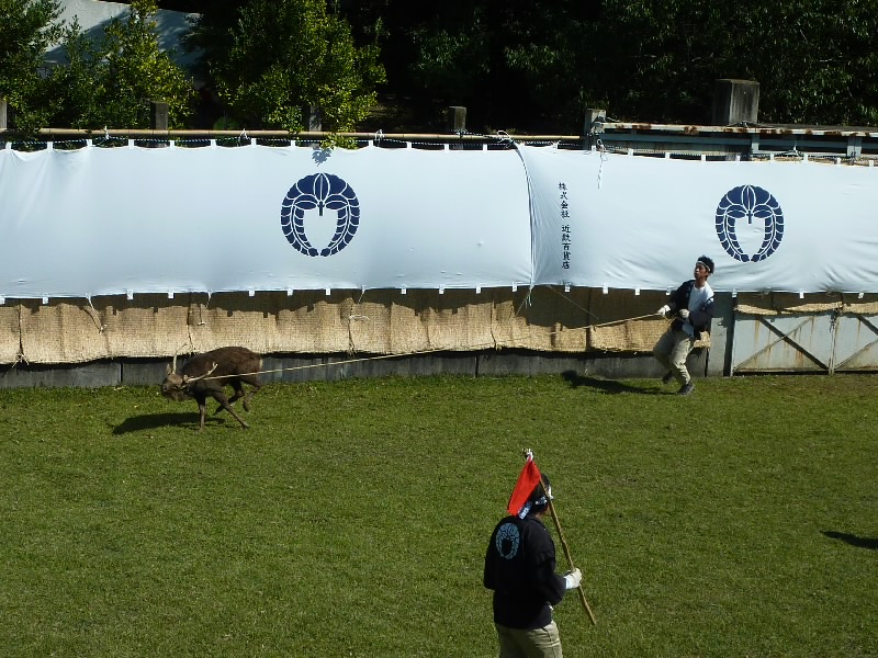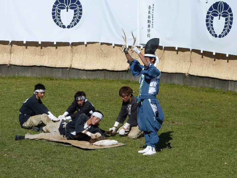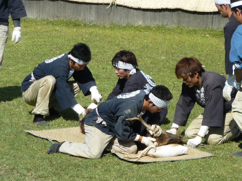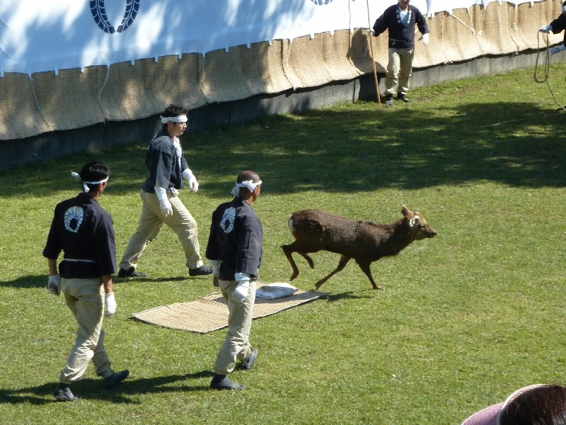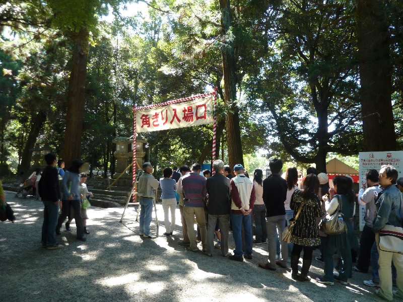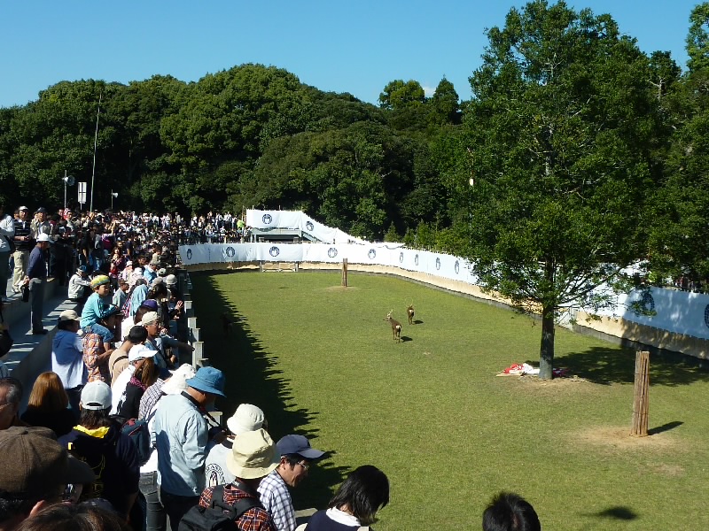 12時からなので11時30分くらいに奈良公園に到着したら、もうすでに長い行列ができていた。丁度開場したばかりで列は動いていたが、すぐに止まってしまい、次の入場は1時間くらい後になるという。そうかあ、11時くらいに着いていないと最初からは入れないのかあ。まあいい、待ちましょう。12時になり、安全祈願祭が始まったようだ。アナウンスが聞こえてきて、しばらくすると角きりが始まった。どんな風に見えるのかな、早く入りたいな。 |