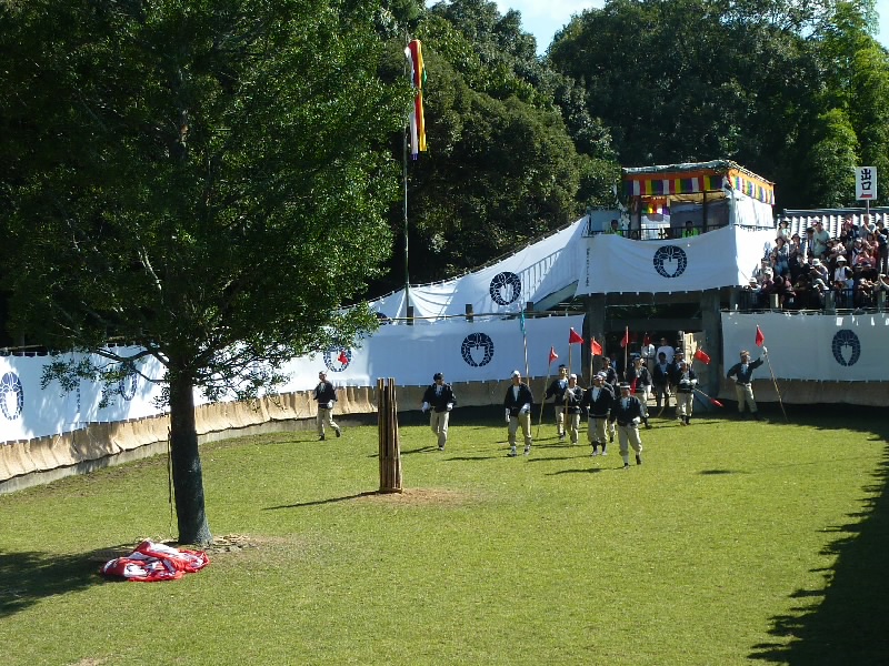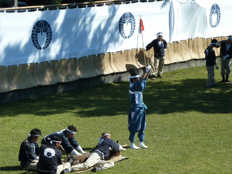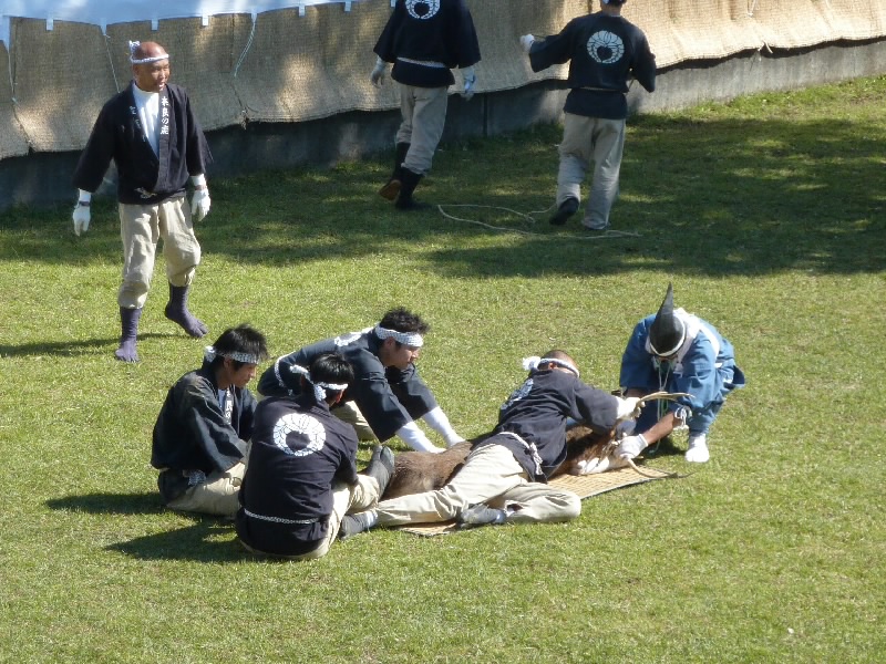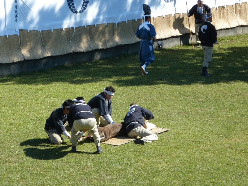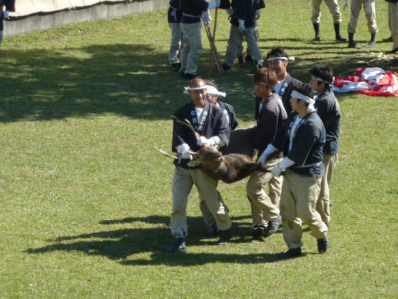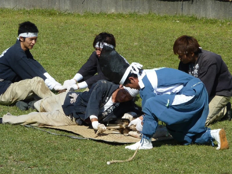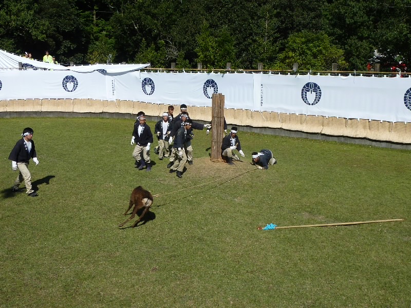 12時からなので11時30分くらいに奈良公園に到着したら、もうすでに長い行列ができていた。丁度開場したばかりで列は動いていたが、すぐに止まってしまい、次の入場は1時間くらい後になるという。そうかあ、11時くらいに着いていないと最初からは入れないのかあ。まあいい、待ちましょう。12時になり、安全祈願祭が始まったようだ。アナウンスが聞こえてきて、しばらくすると角きりが始まった。どんな風に見えるのかな、早く入りたいな。 |