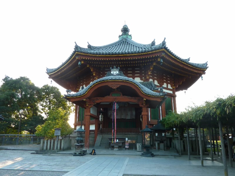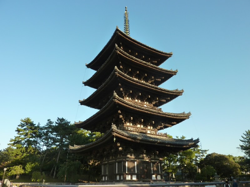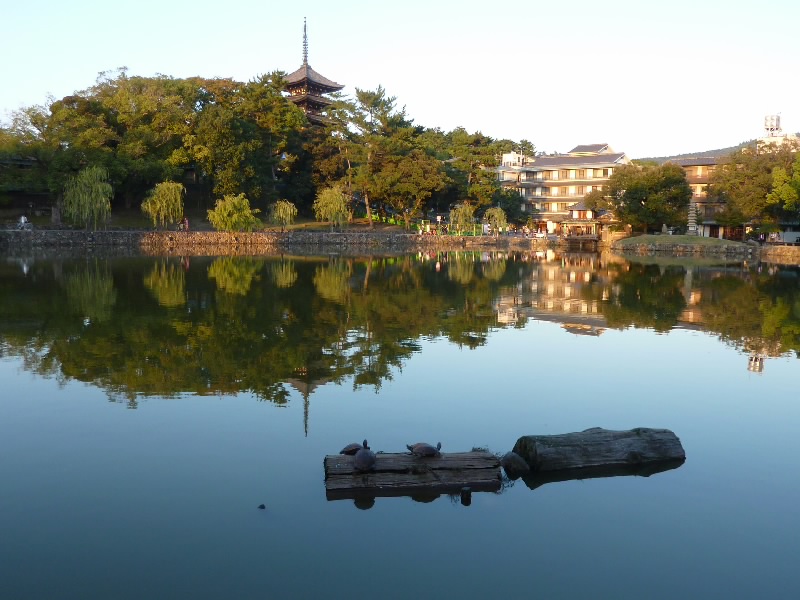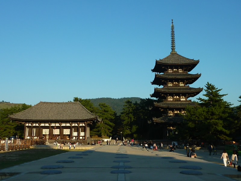 奈良公園をぶらぶら散策。ここは適度に広くて人の数もほどほどで、散歩するのに気持ちがいい。何より天気がいいのが最高だ。しばらく歩いて、興福寺に到着。世界遺産の五重塔と金堂、そして青空が実にいい景色を作っている。それでも日がかなり傾いてきたかな。夕方の近づく雰囲気の中、散策に疲れた人たちが興福寺前や猿沢池のほとりでのんびり過ごしている。この静かでのどかな空気がいいね。 |