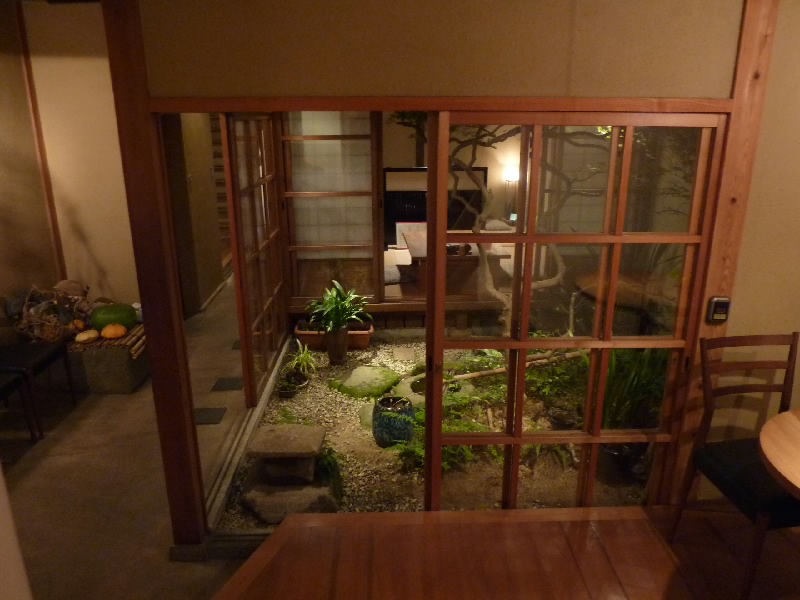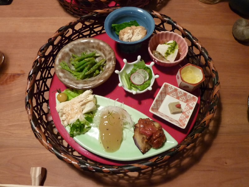 晩ごはんは、奈良町にある「粟」へ。前から行きたいと思っていたお店で、運良く予約を取ることができた。何度か行った「ひより」のすぐ近くにあるお店で、ここも大和野菜がしっかり食べられるお店。楽しみだ。開店してすぐ入ったので、まだ他のお客さんはいない感じ。せっかくなので、野菜尽くしのコースにしましょう。まずはビールでのどを潤し、突き出しはひも唐辛子の炒め物。小ぶりだがしっかりしたシシトウのような感じで、たまに少し辛いのがあるがなかなかの美味。次に来たのが大和伝統野菜の前菜籠盛。これは楽しい籠だ。 すべて野菜で、茄子・冬瓜・湯葉・雑穀豆腐・ラディッシュ・水菜・糸南京・インゲン・豆腐・油揚に大和まな。どれも味がしっかりとしていて、野菜本来の味が楽しい。いいですねえ。続いては季節の天ぷら、これは宇宙芋やシシトウ、カボチャに茄子などさっくりした歯応えで実にうまい。ビールが進み、続いてはお酒をいただきましょう。大和の利き酒セットを頼むと、切子のお猪口が3つ、たっぷりのお酒とともに出てきたぞ。うれしいねえ。そして煮物、これもたっぷりの野菜で、それが吉野葛をまとっている。これもいいですうまいです。お酒も進むというところで、大和芋とろろの陶板焼き。そのままでも食べられるのだが、お好み焼き風に陶板で焼いていただく。ちょっと焦げてしまったのはご愛嬌だが、ふわっとした食感と香ばしい風味がいいですね。そろそろシメ、ここでつけ麺。ゴマベースのちょっと濃い目のダシにもちもちした麺をつけてずるっといただく。絶品ですね。全く肉けのないコースだが、しっかりとした味わいで満足感の高いコースです。最後にデザート、ほくほくカボチャプリンに旬の柿とブドウ、量もちょうどいい感じで大満足です。違う季節にも来て見たいな。 |