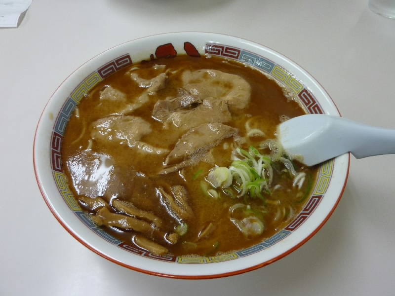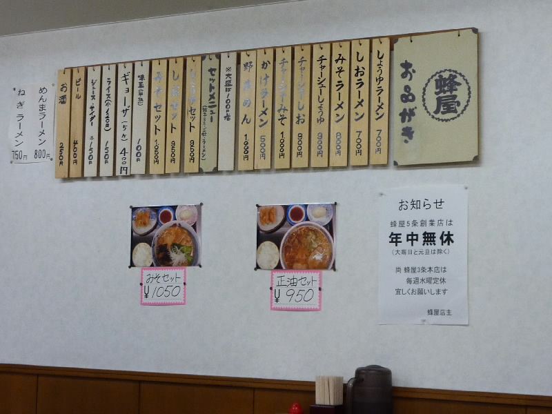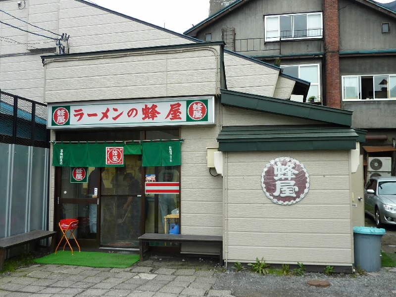 外に出ると、とりあえず雨はやんだようだ。少し歩くと、駅前のメインストリートに到着。去年歩いたところだね。休みの昼間なので、結構人がいる。駅から遠ざかる方向にぶらぶら歩き、少し広い道まで来たぞ。ここを曲がって少し行ったところにあるのが、旭川ラーメンで有名な蜂屋。少し夜ごはんには早いが、去年の青葉と同じく夜閉まるのが早いので、まずはいただきましょう。店に入ると、今の時間帯はそれほどお客さんはいないようだ。初めてなので、基本のしょうゆを注文。脂っこいのと普通のとどちらがときかれたが、やっぱり初めてなので普通が基本かな。出てくるまでの間、店の中の色紙を見ると、やっぱり石ちゃんいるのよね・・・青葉にもあったよね。しばらくして、ラーメン到着。焦がしラードを仕上げにかけた、独特な見た目だ。こってりめのスープの中に香ばしい風味があり、なかなかの美味だ。ただ少し後引く動物臭があるので、苦手な人はいるだろうな。おいしく食べられるのはそれなりに進化しているのかな。きっちり完食し、ごちそうさまでした(@\700)。
