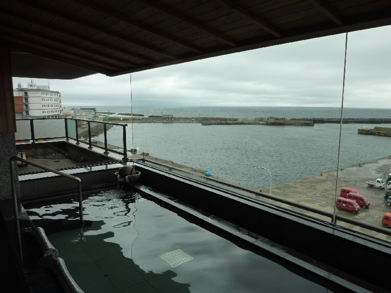 ホテルに戻り、とにかくまずは温泉だ。それほど広くはないが、滝のように湯船に落ちる湯が心地よい。ふう、さっぱりした。部屋は別館だが、その屋上に登ってみる。ぐるっと見渡すと、穏やかな海やスコトン岬にトド島、そして近くには湖もあるんだね。静かで気持ちのいい景色です。