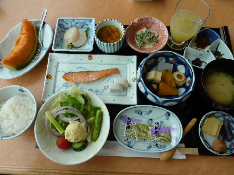 6時過ぎに起床。さっそく温泉へと向かう。ほとんど人がいない中、ゆったりとお湯につかる。今日も天気はいまひとつで、利尻富士もほとんど見ることができない。昨夜はものすごい雨だったので、まあ雨が降っていないだけよしということかな。風呂からあがり、昆布水をいただく。冷たい中にほんのり昆布風味がいいね。部屋に戻り、8時から朝ごはん。もうほかのお客さんはハイキングにでも出かけたのか、あまり食事をしている人がいない。朝ごはんは期待通りいい感じで、ホタテの刺身やうにの茶碗蒸しなど、とてもおいしいな。ごはんのおかずもいろいろあるので2度お代わりし、おなかいっぱいごちそうさまでした。今日のハイキングに栄養補給はばっちりだ。
