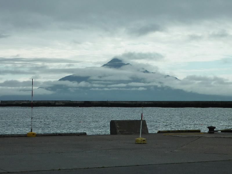 食後は売店へ。朝ごはんに食べた昆布入りの海苔の佃煮と、利尻礼文の花に関する本をゲット(1635)。これなら家でも同じ味が味わえるね。部屋に戻り、9時半ごろチェックアウト。気持ちのいいホテルでした。おかみさんが最後まで見送ってくれた。また来たいなあ・・・港までぶらぶら歩く。少し雨がぽつぽつ来ているが、傘をさすほどではない。昨日歩いた桃岩方面は、昨日と同様どんよりした感じ。とはいえ、温泉からみたときよりも利尻富士が見えるようになってきた。ここまで見えてきたのはこの旅初めて、このまま天気がよくなればいいが。