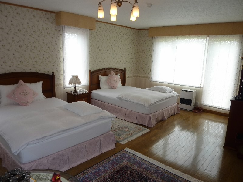 港に着くと、すでに送迎バスが待っていた。早速乗り込むと、どうやらこの時間の予約はわれわれだけのようだ。さて、では今日のホテル、コリンシアンに向けて出発だ。バスは礼文島の東海岸を北へと走る。車窓からは利尻島がずっと見えているが、さっきよりも見えるようになって来たかな。15分ほど走ると船泊の町に入り、ホテルコリンシアンに到着。ん、このあたりは少し晴れて来ているぞ。チェックインの手続きをしながらホテルの人に相談してみる。スコトン岬からの4時間コースを行きたいのだが、昨日の大雨とか今朝の不安定な天気などが不安要素。でもまあ途中で辛かったら迎えに来てもらうということで、とにかく行きましょう。せっかくの機会だしね。ということで部屋にも入れるということで、まずは荷物を部屋へ。昨日とは一転、女の子チックな内装のやたらと広い部屋。ホテルからはトレッキングシューズを貸してくれたり、お昼用のおにぎりを作ってくれたりと至れり尽くせりの準備を行い、送迎車に乗り込む。まずは礼文島最北端のスコトン岬を目指すのだが、さっきよりもどんどんいい天気になっていくぞ。あれれ、今日の午前中は雨予報では?なんだか不思議な気分だが、これはトレッキング日和かもしれない。トレッキングのルートを車で走りながら、ホテルの人にはいろいろと説明をしてもらった。