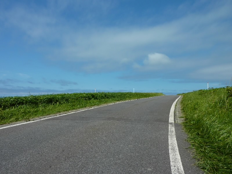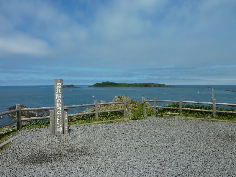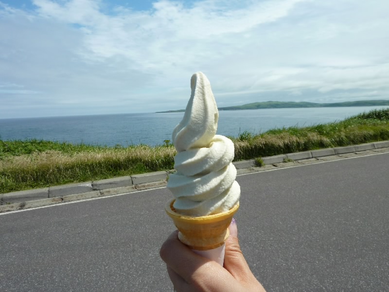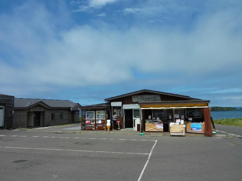 スコトン岬に到着。さっきよりもさらに天気がよくなり、もはや快晴の状態。今朝の様子や天気予報を考えると、まったく想像できなかった。やっぱり日頃の行いかなあ。ホテルの人に別れを告げ、まずは岬の先端の展望台まで。そこに向かう途中、すれ違ったタクシーの運転手さんが独り言で「今日は最高だ」と言ってました。最近天気が悪かったらしいしね。展望台からは、青い空と青い海、そして無人島のトド岩を見ることができる。さわやかな、いい景色だ。もっと空気が澄んでいれば遠くサハリンまで見えるらしいが、夏はほとんど見えることはないらしい。それにしても気持ちがいいな。ここの駐車場そばにある最北端のトイレで用をすませ、最北端の売店で昆布ソフトクリームをいただく(300)。昆布の風味が甘く、なかなかおいしいソフトだな。