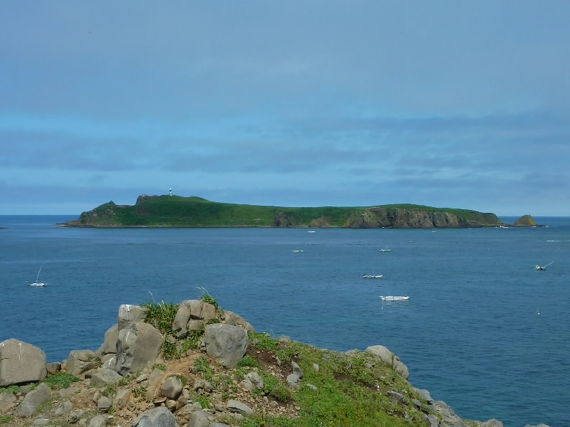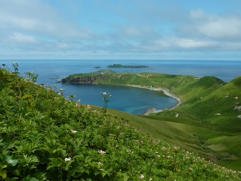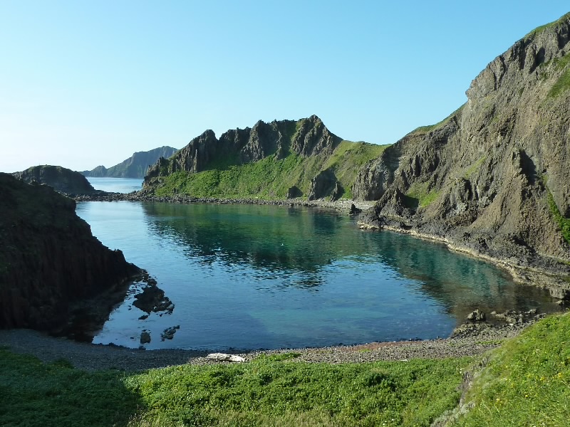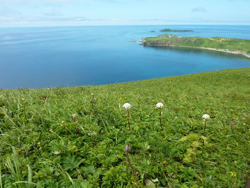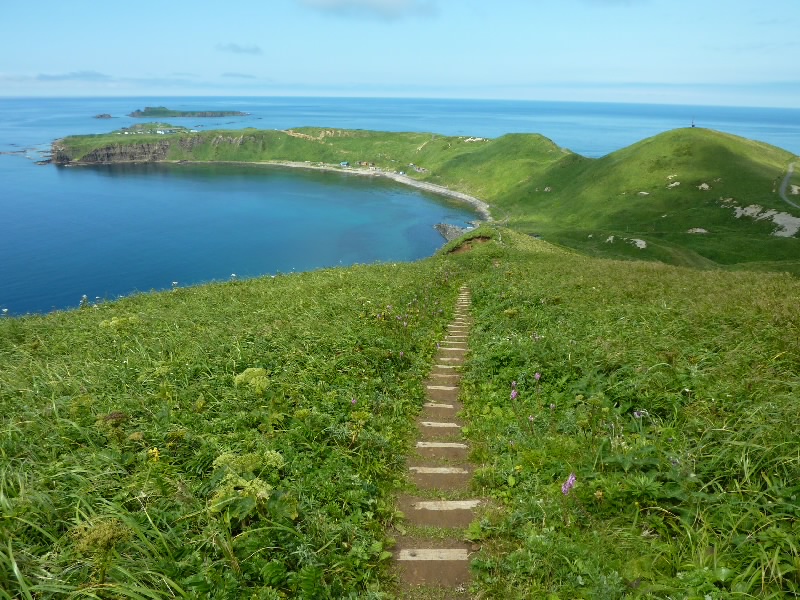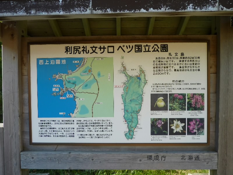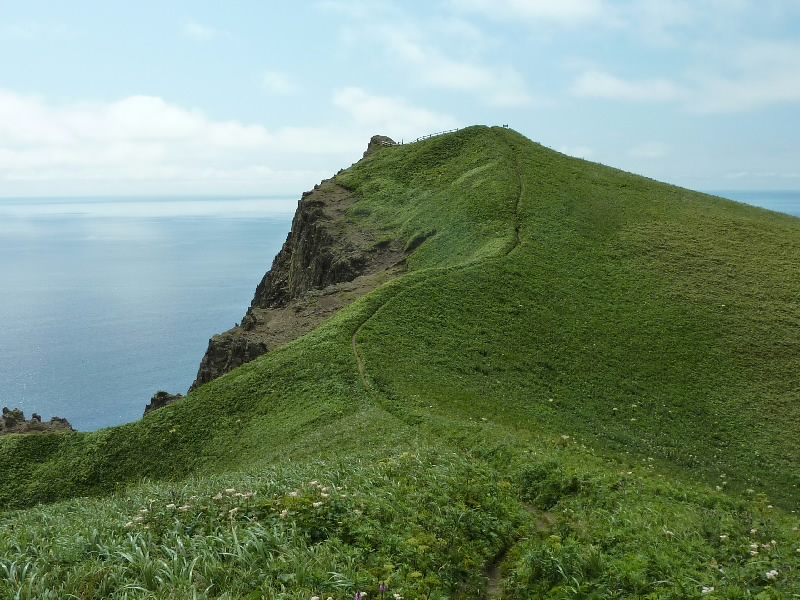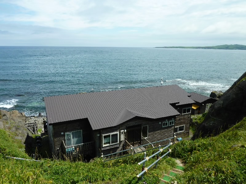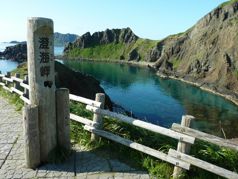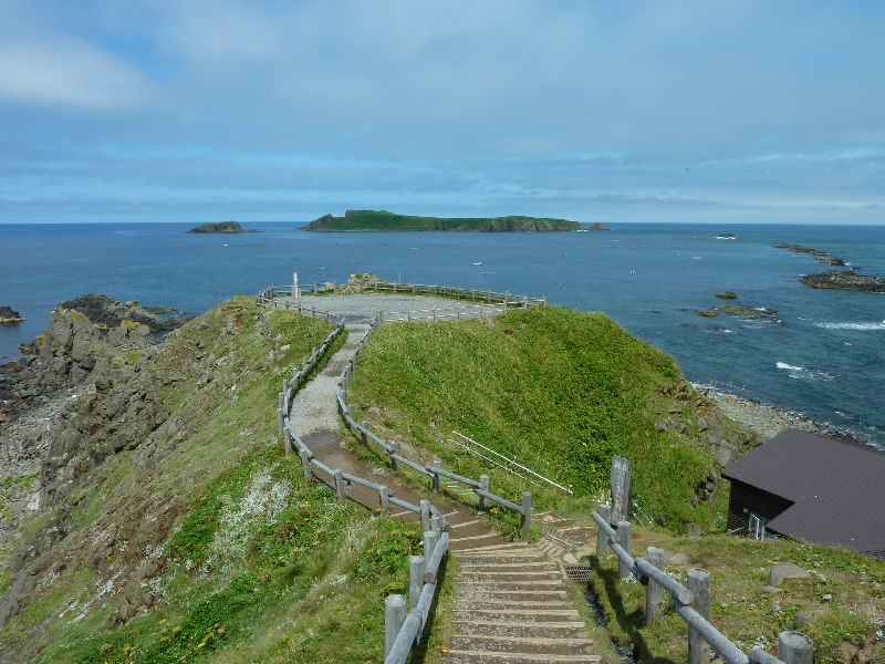 売店で水とポカリを買い(\310)、澄海岬の見える展望台へ。最後の力を振り絞って階段を上がると、青くきれいな海を見下ろせるところに来た。あー疲れた。水とポカリが体に染み渡るね。沖には岩の島があって、たくさんのウミネコがにぎやかに鳴いている。4時間コースのうちの3時間分を歩いたわけだが、確かに昼ごはん休憩を除けば3時間半ほど、写真を撮りながらなのでほぼ予定通りなのかな。礼文島には8時間コースというのもあり、それはここからまだ5時間分歩くわけだし、しかもさらに厳しい道があるらしい。それはきついなあ、そう簡単には踏破できないよね。ゆったりこの展望台で過ごしたあと、ホテルに連絡し、迎えに来てもらう。