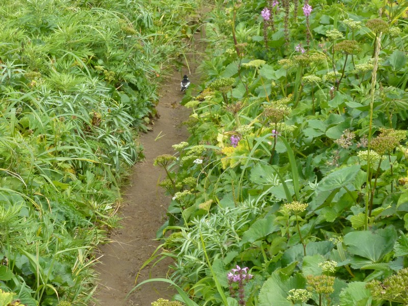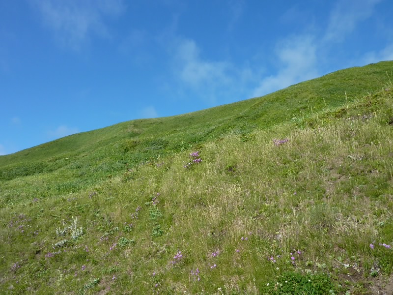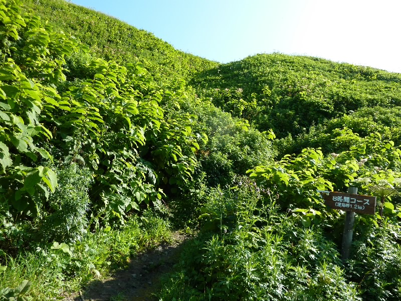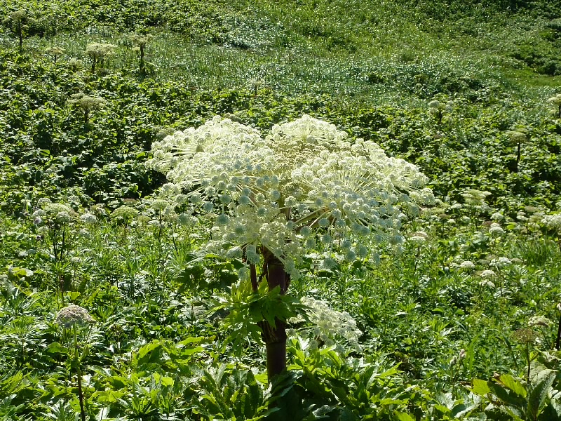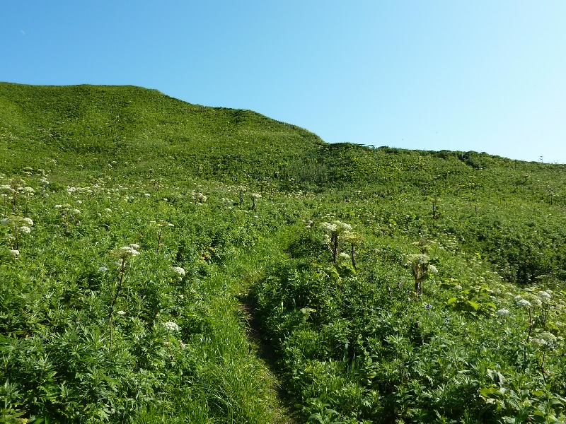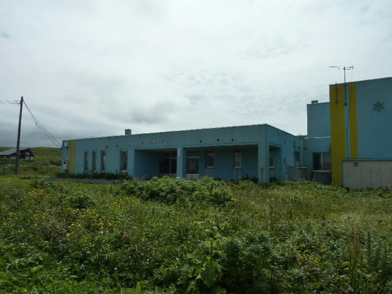 ではいよいよ4時間コースのスタート。とはいえ最後の約1時間の区間は今の時期特に見所が無いらしいので、実質3時間コースになる。でも花を見ながらじっくり歩くともっとかかるんだろうな。歩き始めてすぐに、12時のサイレンが鳴り響いた。しばらくは車道沿いを歩く。エゾニュウが一面咲いているところがあったり、草が風のためか曲がって生えていたりしている。途中に小学校があったが、どうみても廃校しているようだ。昔はこのあたりにももっと人が住んでいたのだろうか。