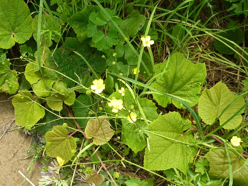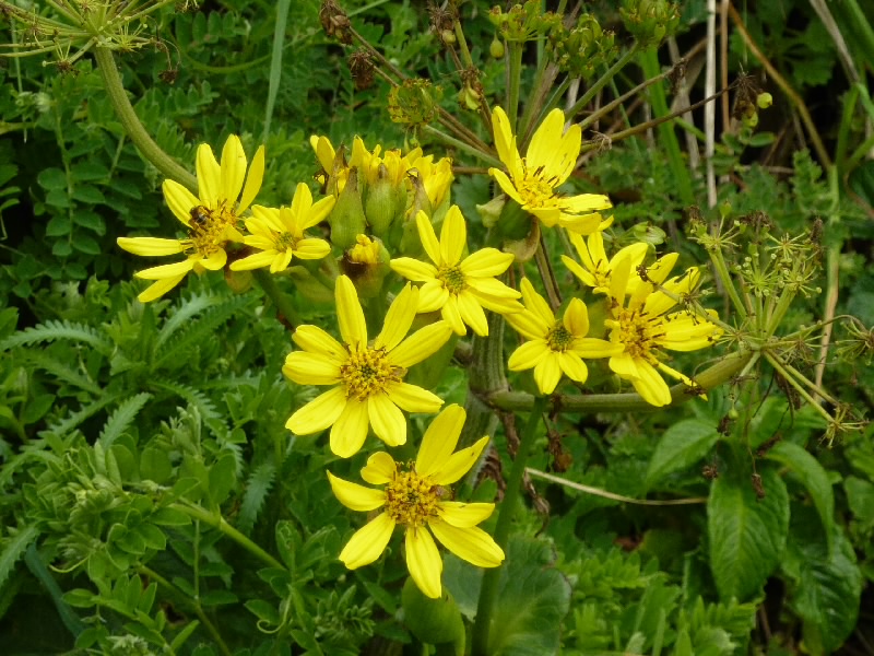 しばらく歩くと、展望台経由か海岸経由かの分岐点に来た。どちらでもいいのだが、海岸沿いだとひょっとしてあざらしに会えるかな、と思い車の通れない海岸ルートを選択。しばらくは下り坂を歩き、山の斜面にいろんな植物を見つける。昨日桃岩展望台に向かう途中に見た花も多いが、今は快晴、光の加減で見え方も違うね。靴もトレッキングシューズなので、気にせず歩けるぞ。