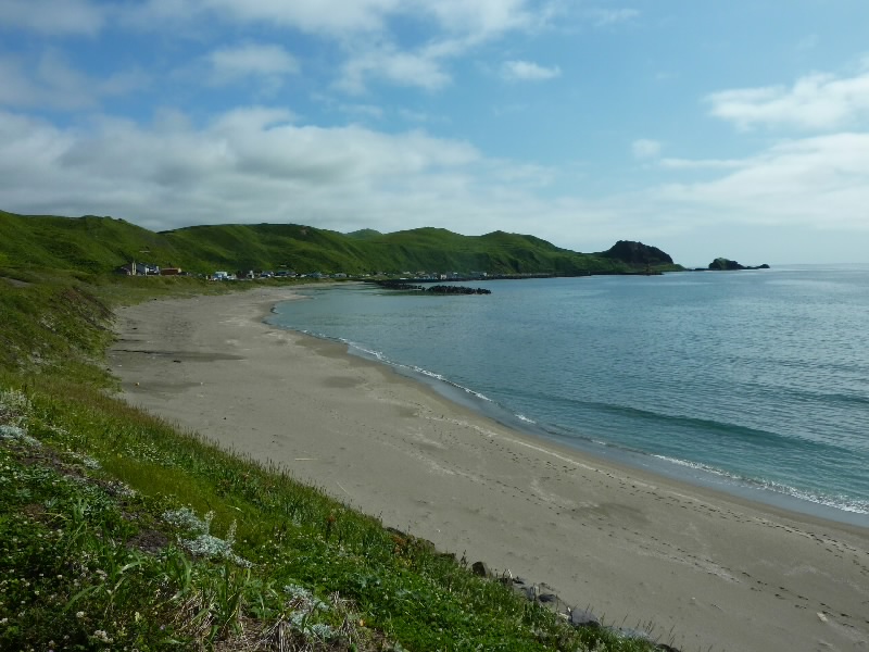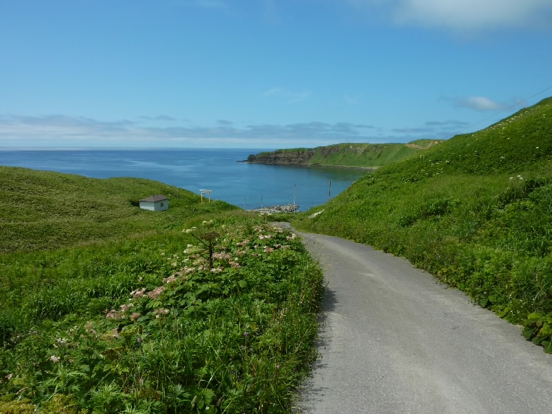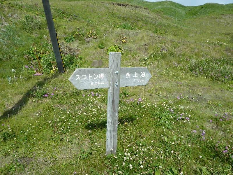 最後に山越えがあるとは言われていたが、これまでにない高い草が茂るまるでけもの道。本当にここか?と思ったがほかに道はないので最後にがんばりましょう。かなり足が疲れているし、この道はぬかるみもあってかなり登りにくい。でもなんとかがんばり、汗だくになりながら丘の上まで登りきる。すると目の前に絶景が広がり、ほんの一瞬で疲れが吹き飛ぶ。さあ、もう少しだ。最後の下り坂を抜け、車道にでるともうゴールは目の前。少し行くと売店のある西上泊に到着だ。スコトン岬から8キロ4時間、ゴロタ岬から2時間の旅、お疲れ様でした。