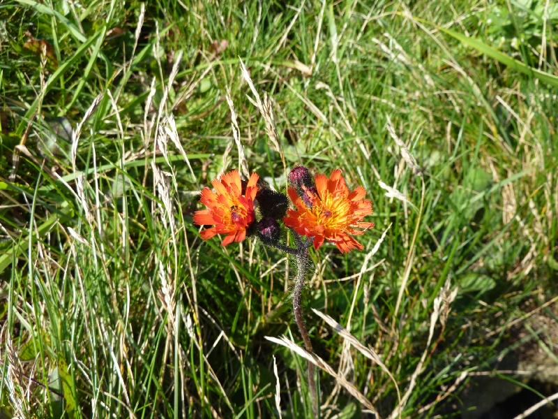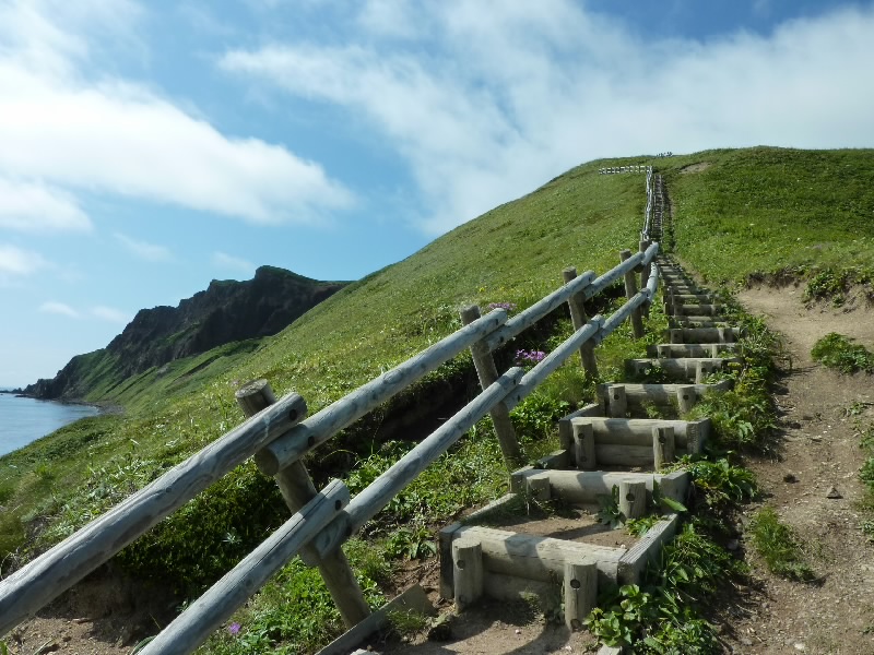 しばらくは尾根つたいを歩く。花畑の向こうに海や岬が見え、快調に歩いていく。両側に海が見えるこの場所は、昨日だったら怖いだろうな。しばらく行くと、ひたすら続く下りの階段。ちょっと歩きにくいが、少しずつ降りていく。それにしてもこの道、もう少し簡単なルートかと思っていたがなかなかハードだ。少しでも若いうちにこれてよかったかも・・・