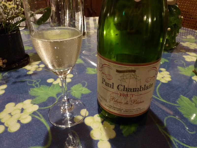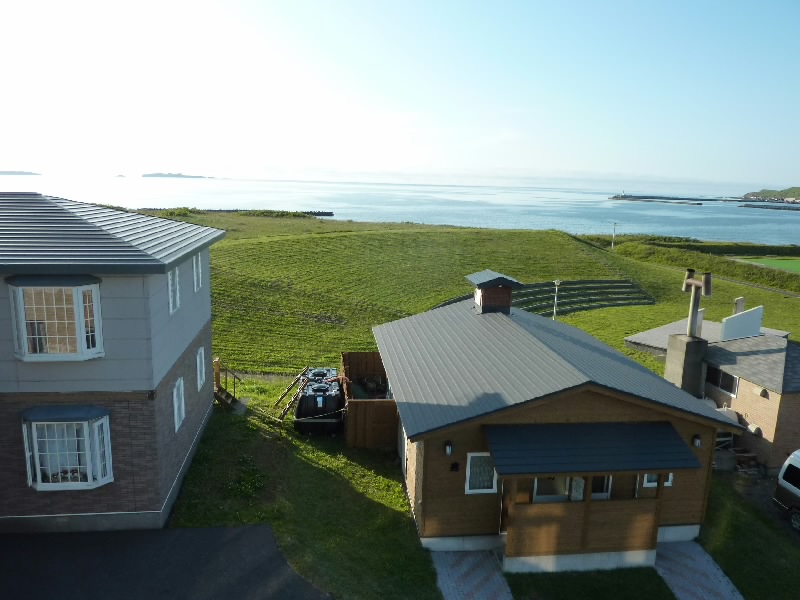 さあ、19時になった。晩ごはんへ行こう。フロントの奥にあるレストランへ行くと、広いテーブルにおかずが用意されていた。うまそう・・・ちょっと今日は雰囲気を変えて、シャンパンをボトルでいただきましょう。まずは乾杯。冷たさと泡がのどに心地よい。さて、いただきますか。もはや定番になった生うに、これは間違いなくうまい。毎日贅沢だなあ。イカの沖漬けになまこの酢の物、これがどちらもやわらかくてうまい。特になまこなんて、こりこりした歯ごたえのものしか食べたことないけどねえ。そしてシーフードサラダ、これは贅沢。新鮮なホタテにぼたん海老、そしていくらが満載。シャンパンにもよく会うし、実にうまいです。と、ここでホテルの人からのお誘い。なんでもこのあとちょうど日没になるので、みんなで見に行きませんかとのこと。食事中だが、それはいいタイミング。せっかくなので行きましょう。ホテルの裏にでて、少し土手を上がると海が見える。