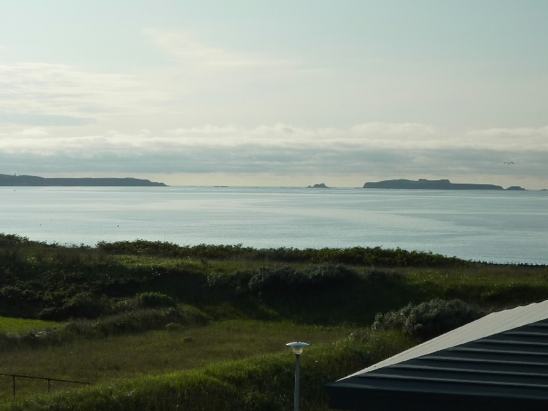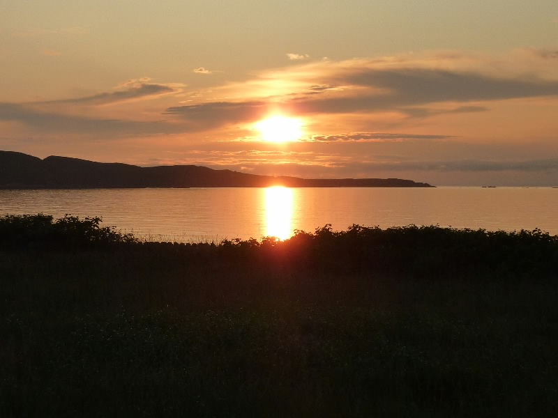 太陽はすでにかなり低くなっており、今日行ったスコトン岬の方に沈むようだ。少し雲はあるが、空がオレンジ色に染まっていく様子はきれいだなあ。ふと、海のほうを見るとアザラシが顔を出しているのが見えた。海沿いにたくさんいるんだね。さあ、そろそろ日没。雲や陸地があるので実際に暗くなり始めるより前に太陽は見えなくなってしまうが、今日という一日を振り返る。天気もよくて、本当によかったな。さて、ごはんに戻りましょうか。