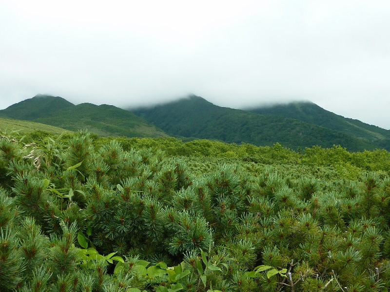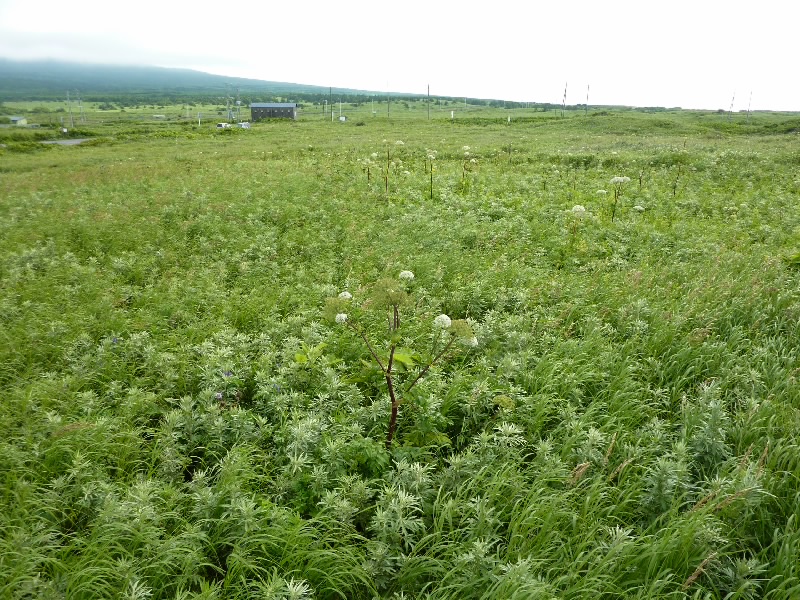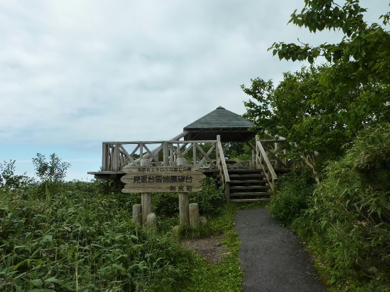 ここからは山を登る。といっても車でだけどね。利尻富士の5合目にある、見返台園地に到着し、ここからは山道を展望台へ。昨日の筋肉痛がちょっときついかも。登る途中にも色んな花が咲いていてきれいだな。10分ほどで展望台に到着。さっきまでいた沓掛岬が遠くに見えている。その向こうには礼文島が見えるぞ。この広い景色が気持ちいいね。振り返ると利尻富士が見えるはずなのだが、いまだに雲の中。もう今日はこれ以上晴れないのかなあ。