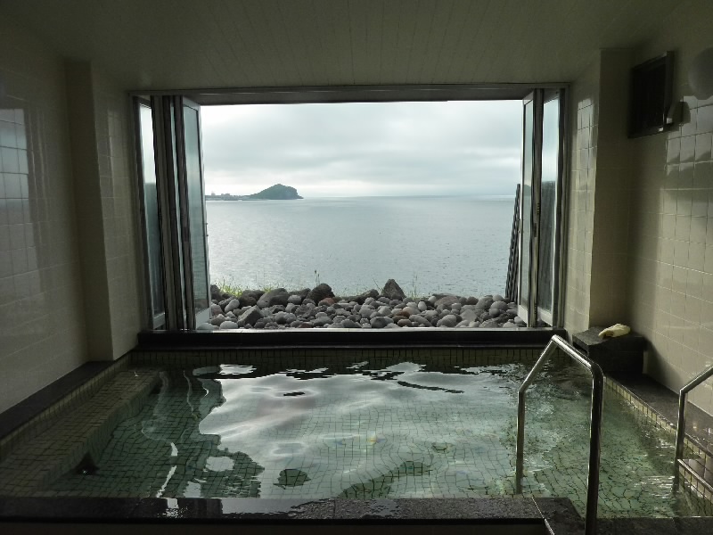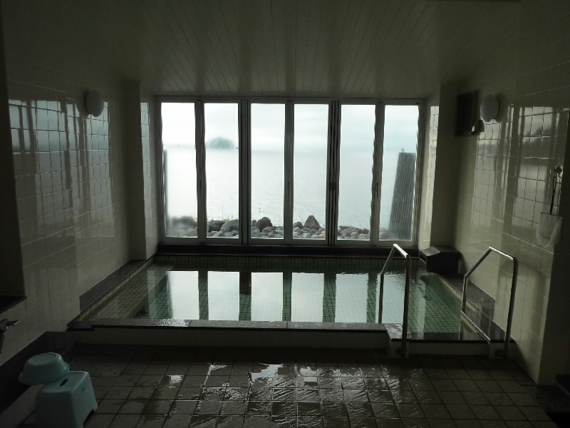 宿の人にフェリーターミナルまで迎えに来てもらい、今日の宿泊・雲丹御殿へ。凄い名前だなあ。夜ゴハンがウニ尽くしらしいので、楽しみです。とにかくまずはお風呂かな。温泉に行くと誰もいない貸しきり状態で、湯船の中に巨大なコンブが沈んでいた。さすが利尻。窓を全開にするとペシ岬から礼文島までが一望でき、気持ちがいい。たまに近くに飛んでくる鳥もなんだかいい感じだ。ゆったりお風呂に入った後はフロントにあるコンブ水をいただく。ほんのりコンブ風味でおいしい。