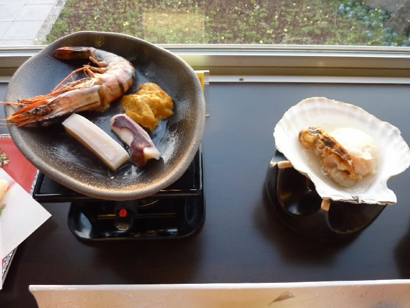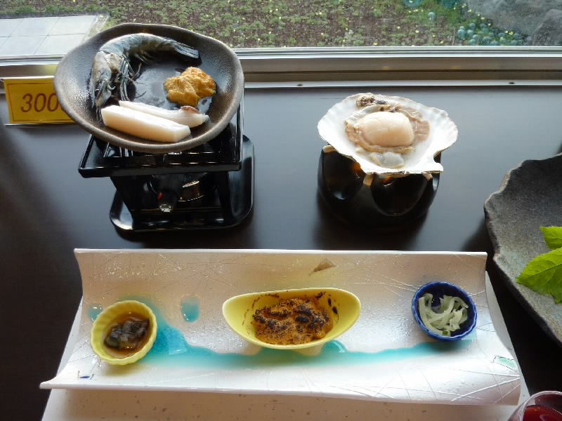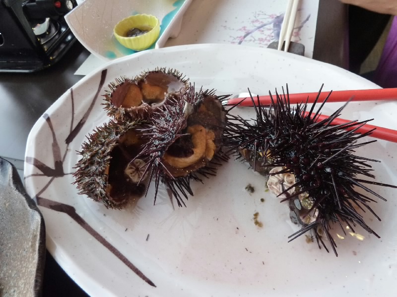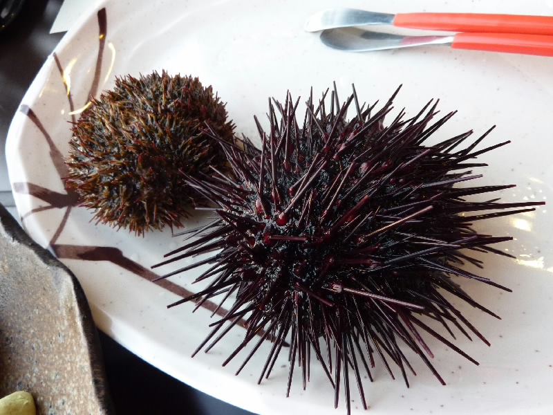 さあ、夜ごはんだ。一階のレストランに行くと、ほとんど人がいない。なんと今日は宿泊客が2組だけだそうで、どうりでお風呂がすいていたわけだ。席につくと、いきなりウニが2つ出てきたぞ。ムラサキウニとバフンウニ、どちらもトゲが動いている。これがどうなるのかと思ったら、いきなり真っ二つに割られた。それでもトゲは動いているんだね、ちょっとホラーだね。でもそんなウニを、小さなへらのようなスプーンでほじくって食べるのだ。人間って一体・・・でも食べる。言ってみればウニの踊り食い、海水が含まれているのでちょっと塩辛いが、究極の新鮮なのでそりゃうまいよね。ムラサキウニ、バフンウニともおいしくいただき、殻だけになってもしばらく動いていました。そのあとはビールを飲みながら、ナマコや焼きウニをいただく。