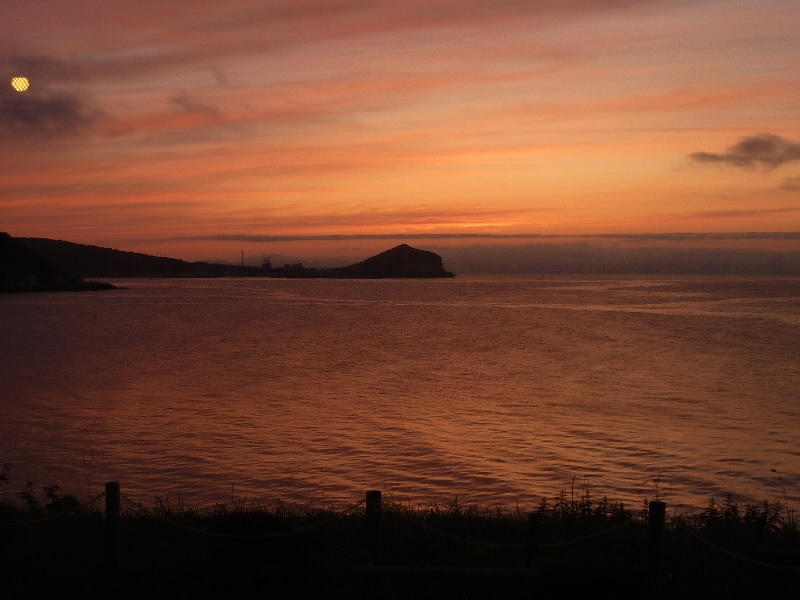 そろそろ日没時間。ちょうど窓からはペシ岬に沈む夕日を見ることができる。きれいだなあ。明日もいい天気になればいいな。なによりも利尻富士がきれいに見えればいいな。