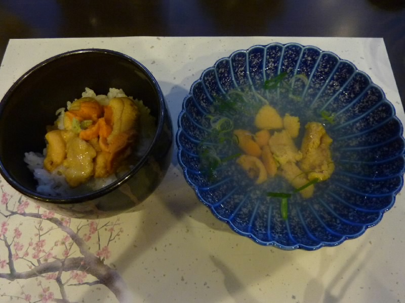 刺身はホッキ貝、タコとカンパチ。脂ののったカンパチで、ビールによくあうね。しばらくして、焼き物ができあがり。陶板焼きはエビ、イカにウニもあり、やっぱりウニがおいしいねえ。もう一つは焼きホタテ、肉厚な食感がいいですね。次に天ぷら、これはエビやニンジンの葉など、抹茶塩とともにおいしくいただく。そして煮物、これはカスベというエイの仲間で、ちょっとクセはあるがしっかりした味付けがおいしい。エイだけに、ヒレぞいに身がすーっと細く取れていく感じがおもしろい。そろそろシメかな、と思っていたらごはんセット登場。これがなんとウニ丼とウニ吸い。オレンジのバフンウニと黄色いムラサキウニ、どちらもたっぷりだ。最後までウニ尽くしだね。いったいいくつ分のウニを食べたんだろうね。デザートにミルクプリンをいただき、ごちそうさまでした。