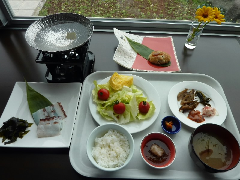 7時ごろ、目が覚めた。窓から外を見ると、たくさんの船が出ていてウニ漁が行われていた。しばらく見ていると、船にはどんどんとウニが積まれていく。そんな中、カラスがウニを一個失敬して飛んでいくのが見えた。だから道にウニの殻が落ちていたりするのかな。