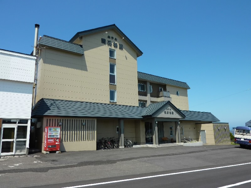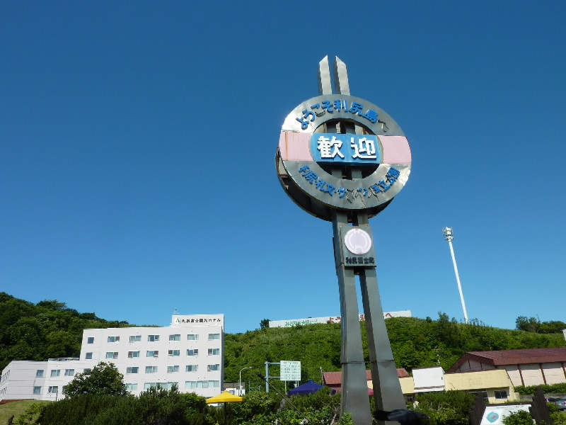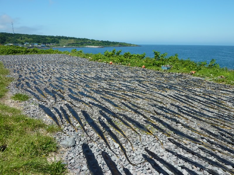 姫沼へと戻る途中に、昆布を干しているところを見た。そのあたりを通ると、昆布の香りが漂ってくる。天気のいい日にどんどん干して、おいしい昆布ができればいいな。しばらく走ると、今朝までいた雲丹御殿に到着。さっき撮りそびれたホテルの写真を撮ったり、すぐそばにある野塚展望台での景色を見たりするが、やっぱりここからもまだ利尻富士の山頂は見えない。展望台のところにはカラスが何羽かいたのだが、そこら中にウニの殻が落ちているのはやっぱり朝の漁から失敬したもの?それにしてもきれいに食べているなあ。