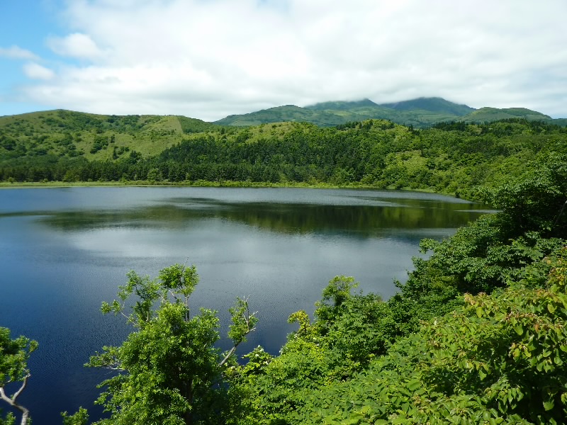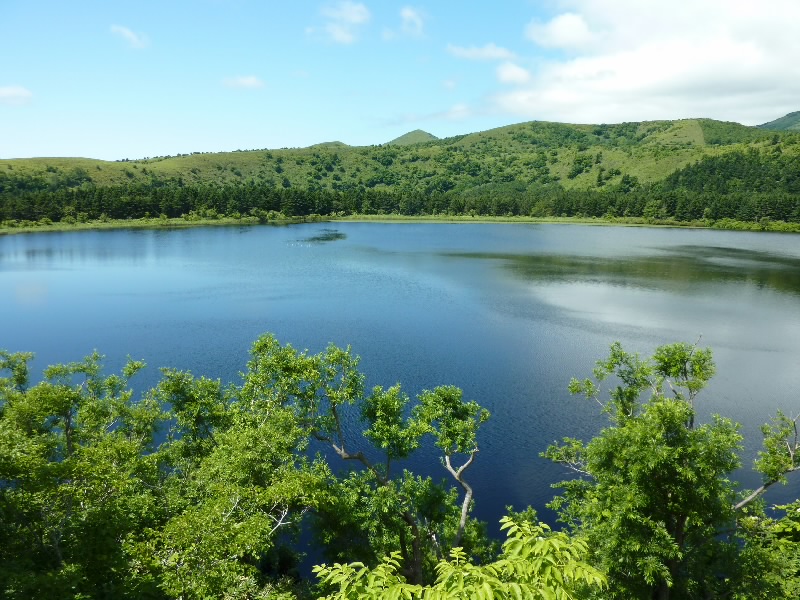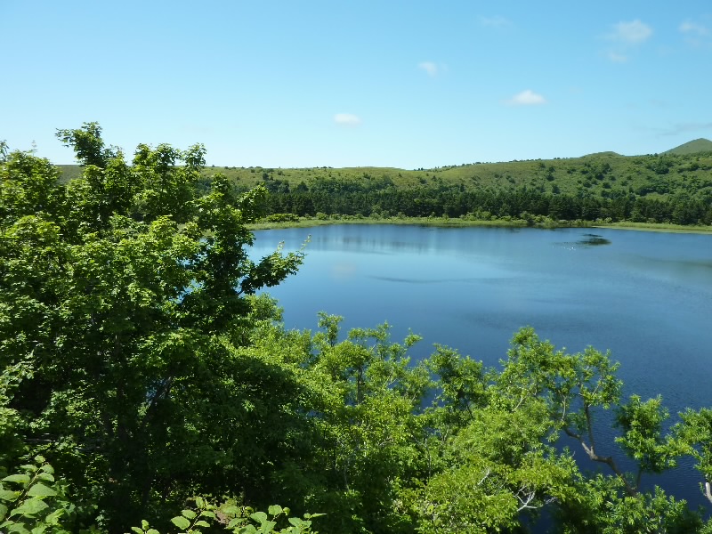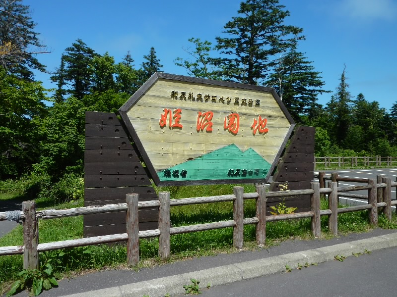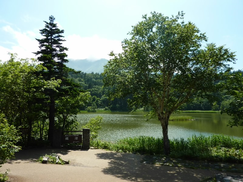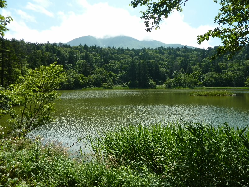 水分補給はこれでばっちり。さて、では利尻富士に期待して、昨日も行ったオタトマリ沼へ行きましょう。昨日も通った道を快調に飛ばし、30分ほどで沼に到着。だいぶ雲は晴れてきたし、昨日よりは見えているが、まだまだ山頂付近は雲の中。うーん、残念だなあ。
