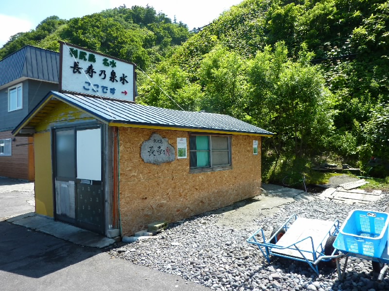 それでは姫沼へ。勝手知ったる道を行き、駐車場へ。少し森の中へ入ると、そこには姫沼があった。ここから見る利尻富士は・・・いまだ山頂は雲の中。おしいなあ、もう一息なんだけどなあ。静かな沼に利尻富士、山頂まで見える絶景を見たかったが、完全に姿を現してはくれなかった・・・仕方ないね。そろそろいい時間、行きますか。それにしても、レンタル3時間だとこのくらいがせいいっぱい。昨日来ていたからまだいいが、初めてだと本当に車で一周しただけで終わってしまうかもね。姫沼を発ち、すぐにあるのが長寿の水。さっき汲んだ甘露泉水がもう3本なくなってしまったので、ここで補給しておきましょう。ここもまた冷たくておいしい水、いいなあ。