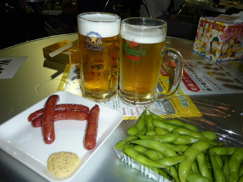 行ってみると、そこは世界のビール会場。とはいえ日本のビールもあるし、おつまみもいろいろあるのでまずはここがいいかな。というわけで、日本代表のサッポロクラシックとデンマーク代表のカールスバーグで乾杯だ。うーん、のどに染み渡るこの感覚、やっぱり夏はビールだね。昨日までは海鮮三昧だったので、今日は枝豆とソーセージが妙にうまい(\2260)。昼間は暑かったが今は少し涼しくさわやかな、夏の北海道に乾杯だ。気持ちよくていいのだが、新千歳でお土産を試食しすぎてあまりおなかが減っていなかったのか、すぐに満腹になってきた。