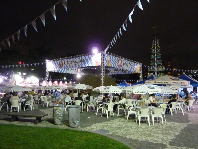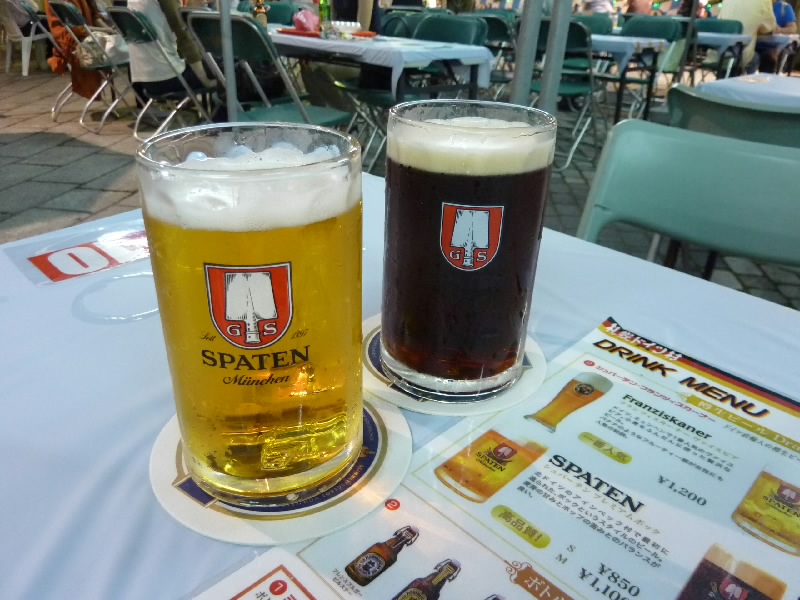 しばらくして、この会場もだんだんと賑わってきたし周りが妙に煙くなってきたので、そろそろ行きますか。隣の11丁目会場へ行くと、そこはドイツビールがいろいろ楽しめる場所になっていた。これもいいね。ドイツビールの種類がいろいろあるし、なにより小ジョッキがあるのがありがたい。というわけでおなかはいっぱいだが、もう少しビールを楽しみましょうか。シュパーテンのプレミアムボックとオプティメーターで乾杯だ(\1600)。この会場が一番落ち着くなあ。ほかはちょっと騒がしすぎたからね。アーモンドのお菓子をゲットし(\700)、つまみながらビールを楽しむ。