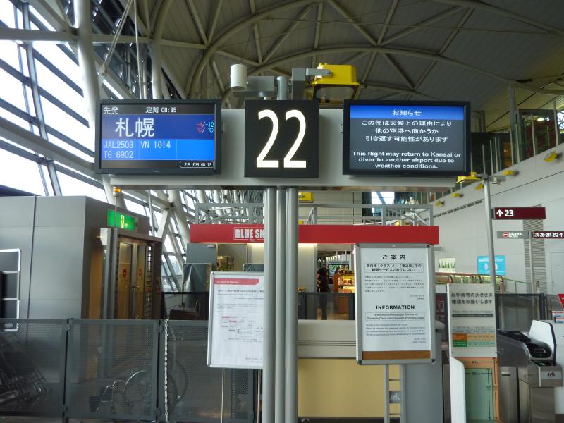関空発8:35札幌行き。これに乗るためには、5時起きで準備をしなければ。かなり早いがなるべく早めに着いたほうがいいしね。JALのキャンペーンで、たった17000マイルで2人札幌の往復、しかもちょうど雪まつり。ベストタイミングだ。8時前に関空に到着。通勤の人も多く、結構電車も混んでいた。なんだかずいぶんと縮小されたJALのチェックインカウンターへと行くと、意外な表示が。「天候上の理由により他空港か引き返す可能性があります」なんですと?係の人に聞いてみると、今日はかなりあれる予報がでており、札幌千歳が天候不良の時は機長判断で帯広に降りるか、あるいは引き返す可能性があるとのこと。いやいや、それなら帯広行ってください。それなら屋台を楽しんでとかできるが、引き返されたら何もできない。あとは天気頼みだが、もちろん札幌行きが一番いいのだが帯広もいいなあ。念のために以前泊ったリッチモンドの空きを確認。これで帯広でも全く問題はない。さて、朝ごはん用にめはり寿司を買い、出発ゲートへと向かう。