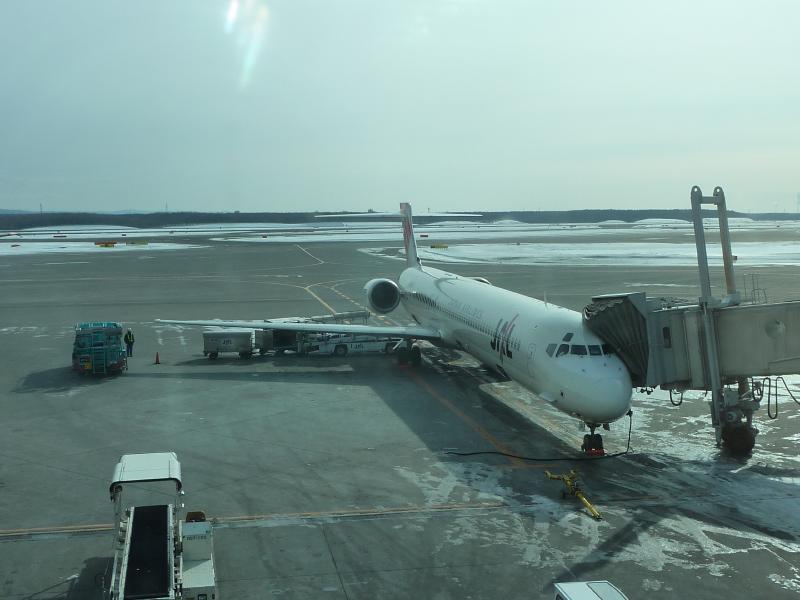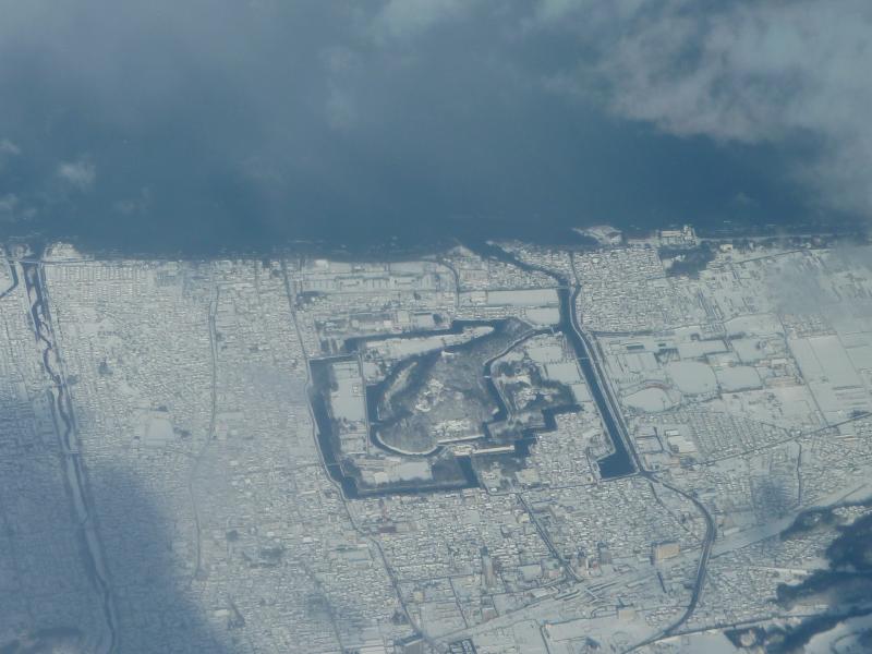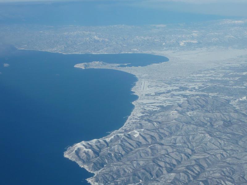 飛行機へと乗り込む。定刻通り離陸したが、機内アナウンスでも帯広または関空に戻る可能性を説明している。もういっそのこと帯広に行くと言ってくれ!関空から札幌へは初めて乗ったが、見下ろす景色がちょっと新鮮。神戸空港が見えたり、雪に覆われた京都市内と琵琶湖が並んで見えたり、彦根城が見下ろせたり。その後すぐに、雲に隠れて見えなくなった。やっぱり日本海側はかなりの雪なのかな。めはり寿司で腹ごしらえし、朝早かったので少しうとうと。しばらくして目が覚め、窓を見ると青い空とそこに浮かぶモノトーンの半島。どこだここは?よく見ると海に突き出して見えるのは函館だね。なんだ、ここはものすごい快晴ではないか。その後飛行機は徐々に高度を下げ、快晴の苫小牧港を眼下に見ながら新千歳国際空港に到着。定刻通りだし、快晴だし。天気の心配なんて何もいらなかったな。でも予報ではこのあと崩れるそうなので、どうなることやら。とにかく我々は予定通り到着できてよかった。でも本当は帯広でもよかったんだけどね・・・