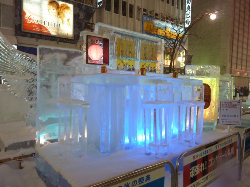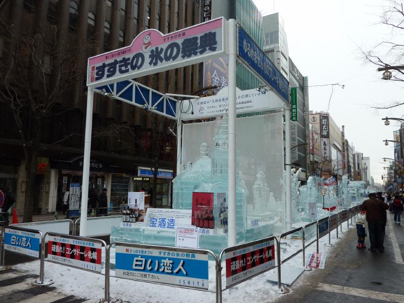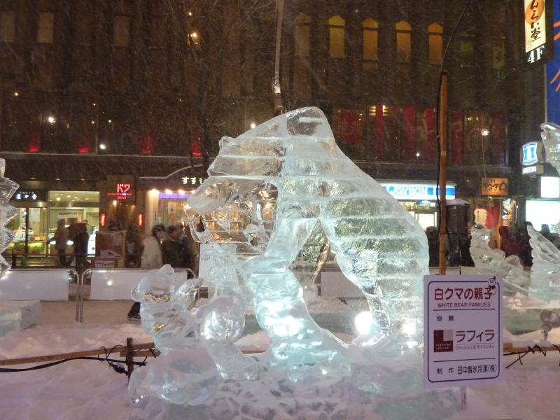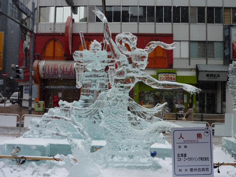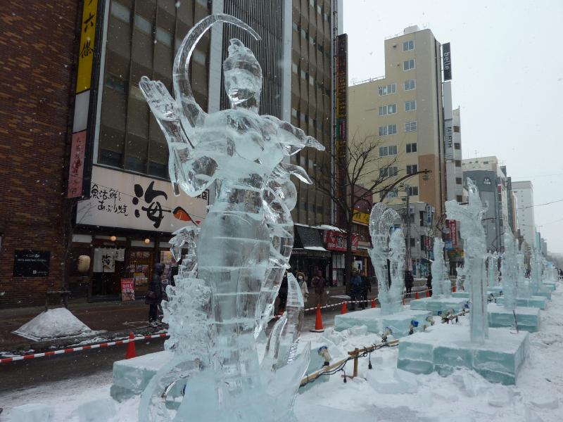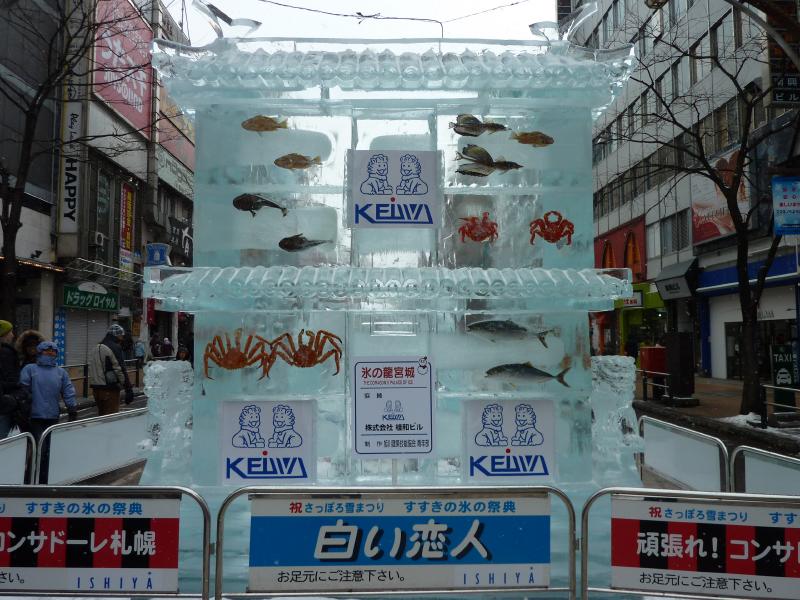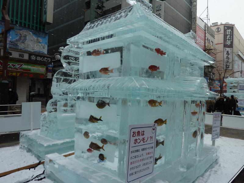空港から市内へはいつもは電車を使うのだが、今日の宿はススキノだしちょうどススキノ行きのバスがあるので、これでいきましょう。バスは白銀の世界を走ってはいるのだが、天気が良すぎてバスのなかは暑くなってくる。なにせ厚着だしね。札幌ドームの脇を通り抜け、1時間ほどでススキノに到着。バスを降りると、外は肌を刺すような寒さだ。最初だけは気持ちよかったが、すぐに指先が冷たくなってきた。今日は-12℃まで下がるらしいし、少し天気も曇ってきたようだ。とにかくまずは今日から3泊するホテル、東急ホテルにチェックイン。まだ部屋には入れないので荷物を預かってもらい、さっそく雪まつりを楽しみに行きますか。雪まつりは会場が3つあり、雪像が並ぶのは大通り会場。まずはそこではなく、ホテルに近いススキノ会場へ。ここは趣向を凝らした氷の像がたくさん並んでおり、これは雪まつりならぬ氷まつりだね。歩行者天国になった道をぶらぶらと歩き、たくさんの氷像をみる。いろいろあるが、やっぱり面白いのは魚の氷漬けかな。南の魚バージョンと北の魚バージョンがあり、まさに泳いでいる姿のまま凍っている。やっぱり南はカラフルで、北はおいしそうだ。できれば北にイカやタコなんかがあっても面白いんだけどね。