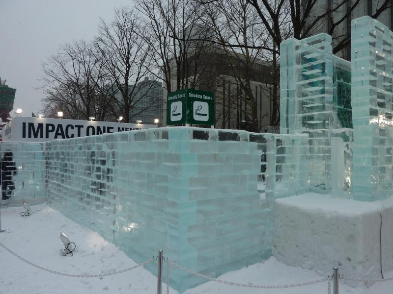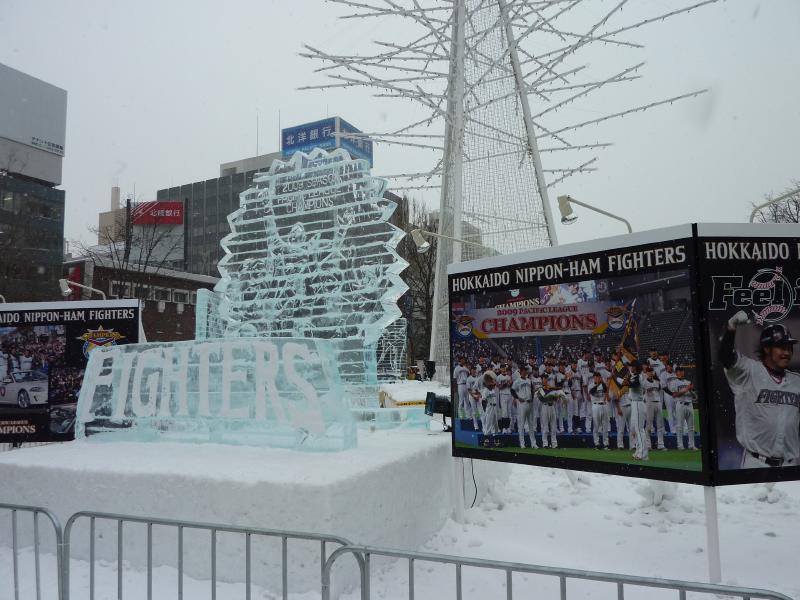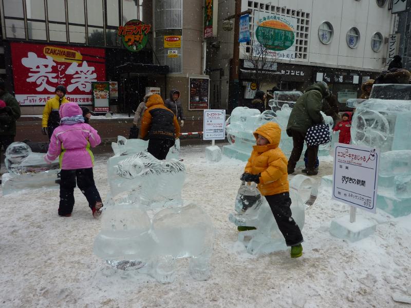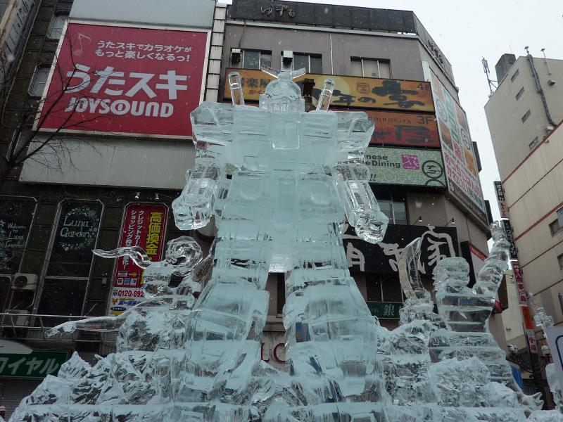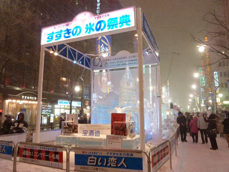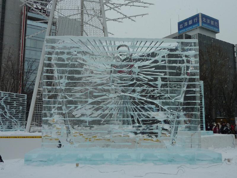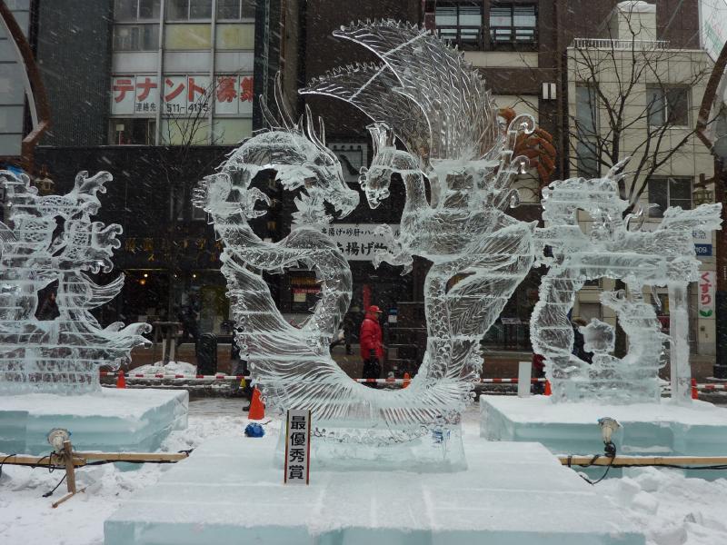 空港から市内へはいつもは電車を使うのだが、今日の宿はススキノだしちょうどススキノ行きのバスがあるので、これでいきましょう。バスは白銀の世界を走ってはいるのだが、天気が良すぎてバスのなかは暑くなってくる。なにせ厚着だしね。札幌ドームの脇を通り抜け、1時間ほどでススキノに到着。バスを降りると、外は肌を刺すような寒さだ。最初だけは気持ちよかったが、すぐに指先が冷たくなってきた。今日は-12℃まで下がるらしいし、少し天気も曇ってきたようだ。とにかくまずは今日から3泊するホテル、東急ホテルにチェックイン。まだ部屋には入れないので荷物を預かってもらい、さっそく雪まつりを楽しみに行きますか。雪まつりは会場が3つあり、雪像が並ぶのは大通り会場。まずはそこではなく、ホテルに近いススキノ会場へ。ここは趣向を凝らした氷の像がたくさん並んでおり、これは雪まつりならぬ氷まつりだね。歩行者天国になった道をぶらぶらと歩き、たくさんの氷像をみる。いろいろあるが、やっぱり面白いのは魚の氷漬けかな。南の魚バージョンと北の魚バージョンがあり、まさに泳いでいる姿のまま凍っている。やっぱり南はカラフルで、北はおいしそうだ。できれば北にイカやタコなんかがあっても面白いんだけどね。