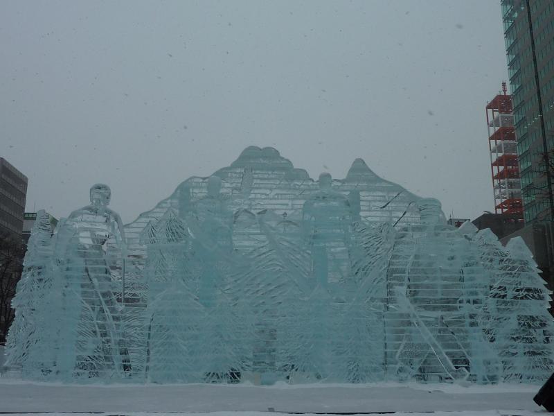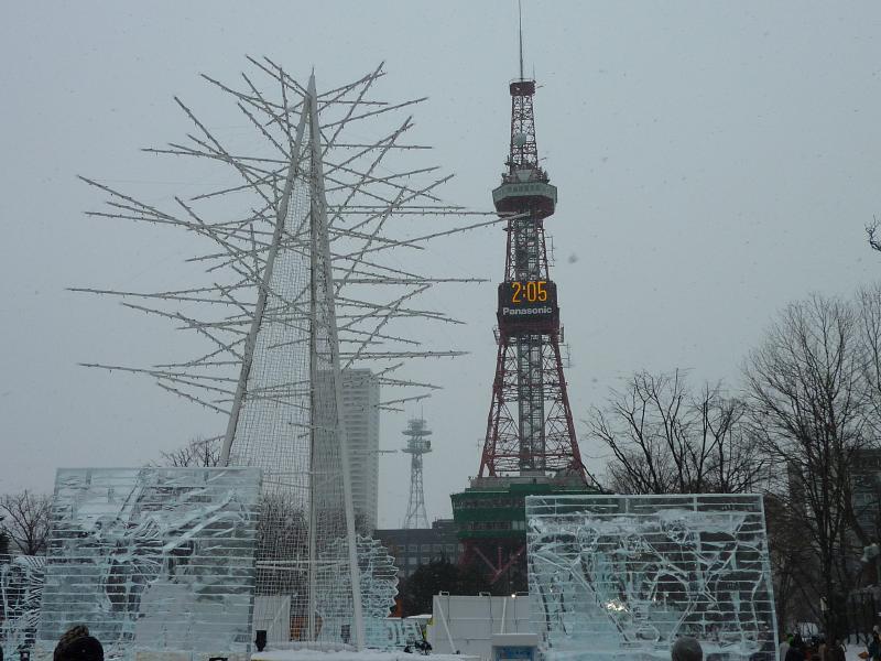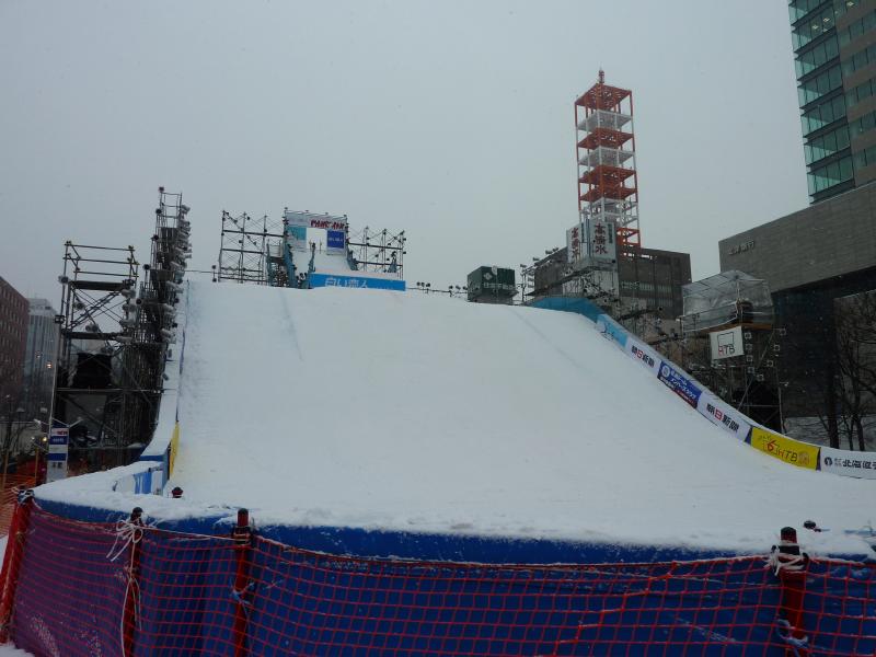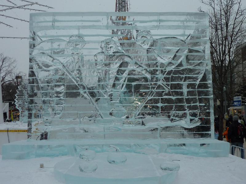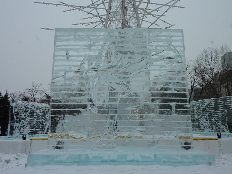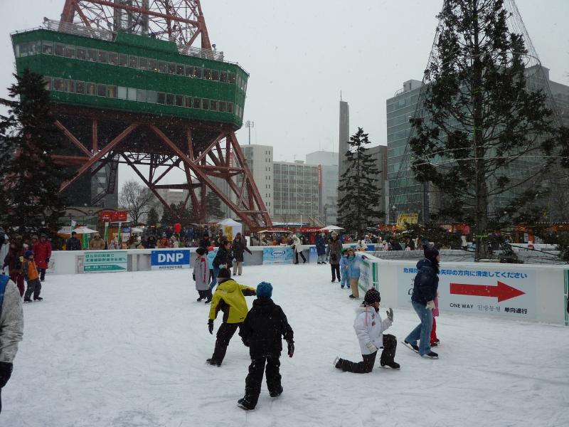 さて、では大通り会場へと行きましょうか。1丁目から12丁目までいろいろと趣向をこらした像やイベントなどが行われているが、一気には見られないのでまずは駅に向かう道の右側、1〜3丁目エリアへと行きますか。まずは3丁目、ここはスノーボード会場になっていて、巨大な雪の斜面が出来上がっている。もう少し後でイベントがあるようなので、ここは後ほど。2丁目に行くと、ここは冬のスポーツにまつわる氷像が並んでいる。もうすぐバンクーバーオリンピックということもあり、カーリングやフィギュア、モーグルなどオリンピックにちなんでいるようだ。オリンピックは来週開幕、楽しみだね。1丁目にはスケート場があり、たくさんの人が滑っていた。子供も上手にすべるんだね。スケートなんて20年以上やったことないが、立つのも大変なんだろうね。ここにはテレビ塔もあって公園を見渡せる展望台に登れるのだが、それは夜がいいのでまたの機会に。